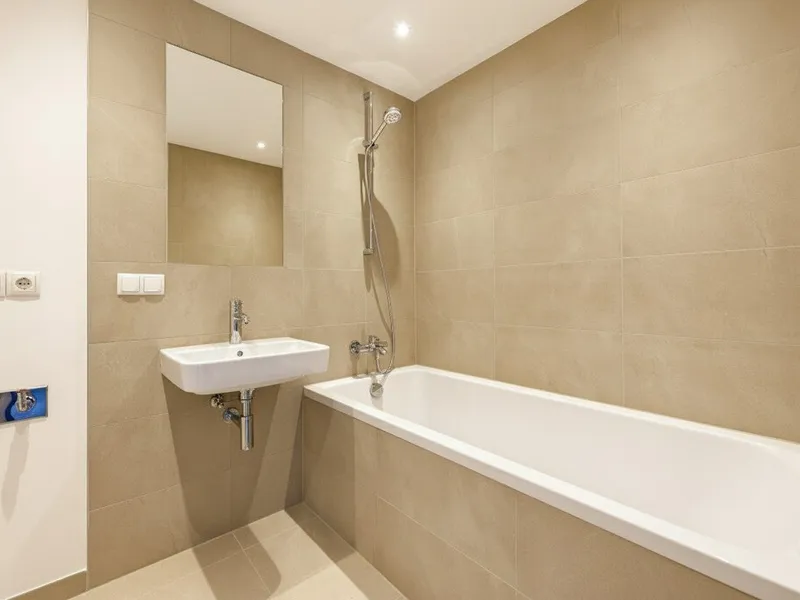 Das Schlafzimmer mit angrenzendem en Suite Badezimmer mit Badewanne, Handwaschbecken, Handtuchwärmer und Waschmaschinenanschluss ist außergewöhnlich hell und freundlich. Sogar im Badezimmer findet man ein bodentiefes Fenster für extra viel Tageslicht und eine angenehme Atmosphäre.