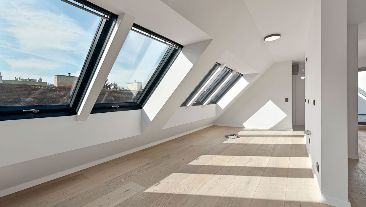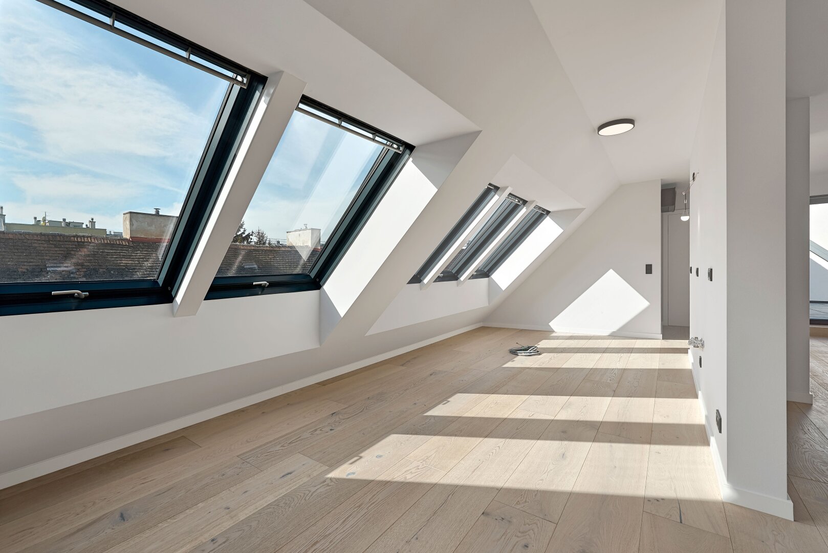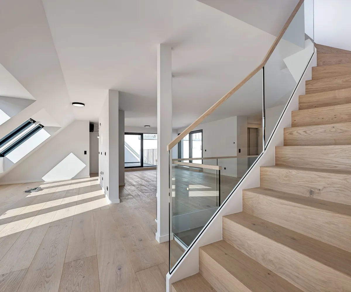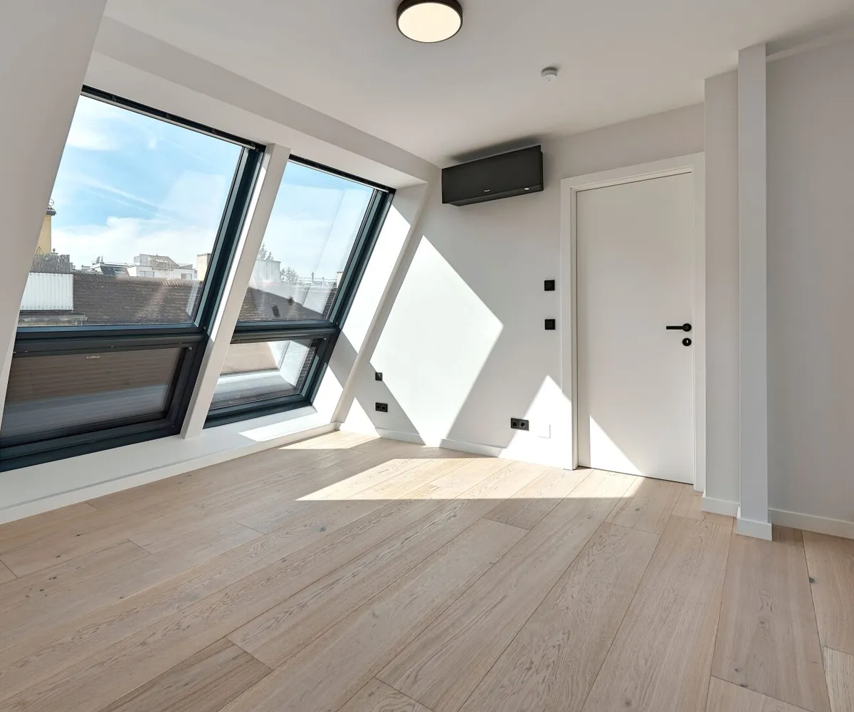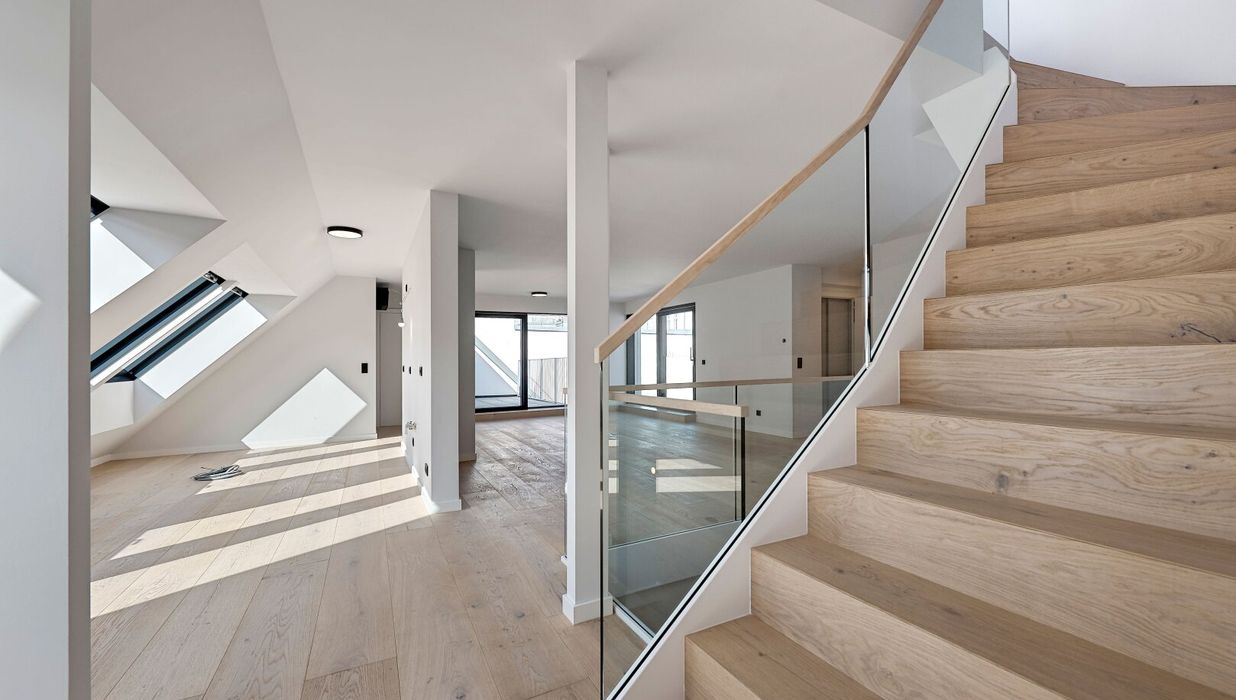 Die Dachwohnungen (drei Einheiten im 1. Dachgeschoß und das Penthouse im 2. Dachgeschoß) setzen dem Projekt die Krone auf. Großflächige Fensterfronten durchfluten die Wohnräume zu jeder Tageszeit mit natürlichem Licht.