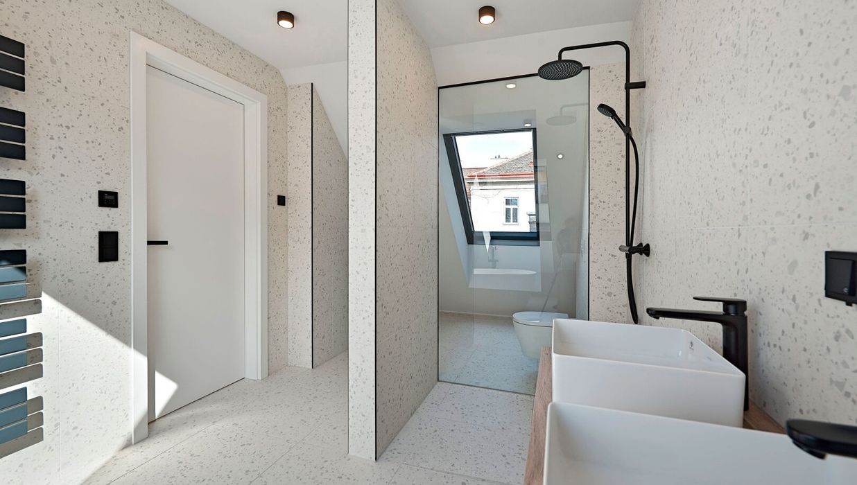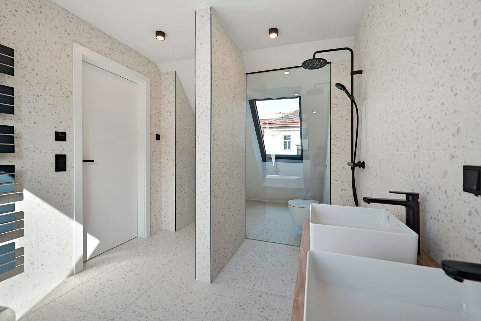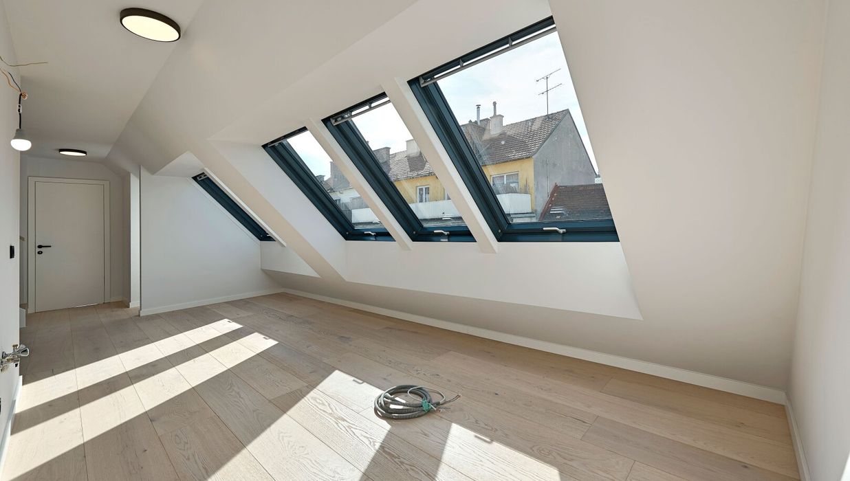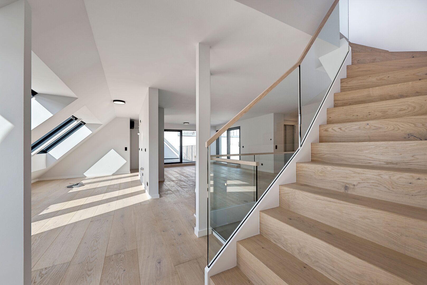 Die Dachwohnungen (drei Einheiten im 1. Dachgeschoß und das Penthouse im 2. Dachgeschoß) setzen dem Projekt die Krone auf. Großflächige Fensterfronten durchfluten die Wohnräume zu jeder Tageszeit mit natürlichem Licht.