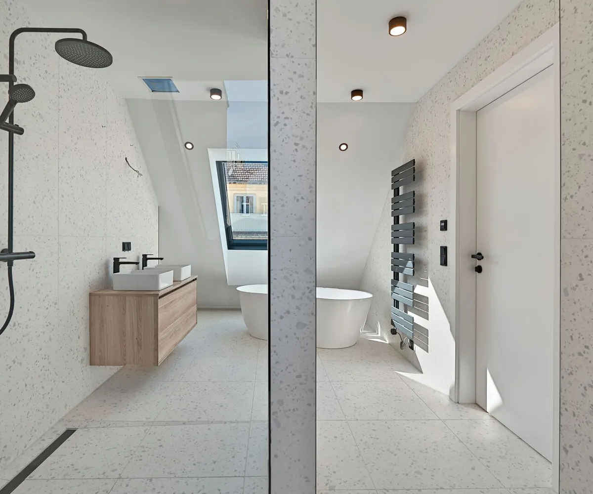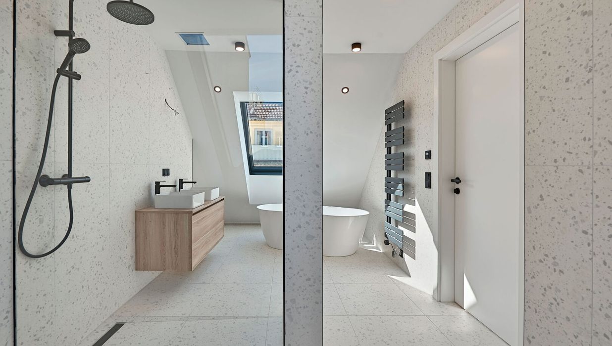 Die zwei Schlafzimmer mit ca. 15 qm und 16 qm sind über die Wohnküche zugänglich und ruhig zur kaum befahrenen Straße hin ausgerichtet. Sie bieten höchsten Komfort und Platz für ein großzügiges Bett und einen Kleiderschrank. Die beiden en Suite-Badezimmer sind meisterhaft gestaltet: freistehende Badewannen, elegante Walk-In-Dusche, eigene Toiletten und Doppelwaschbecken laden zu einem Wellness-Erlebnis im eigenen Zuhause ein.