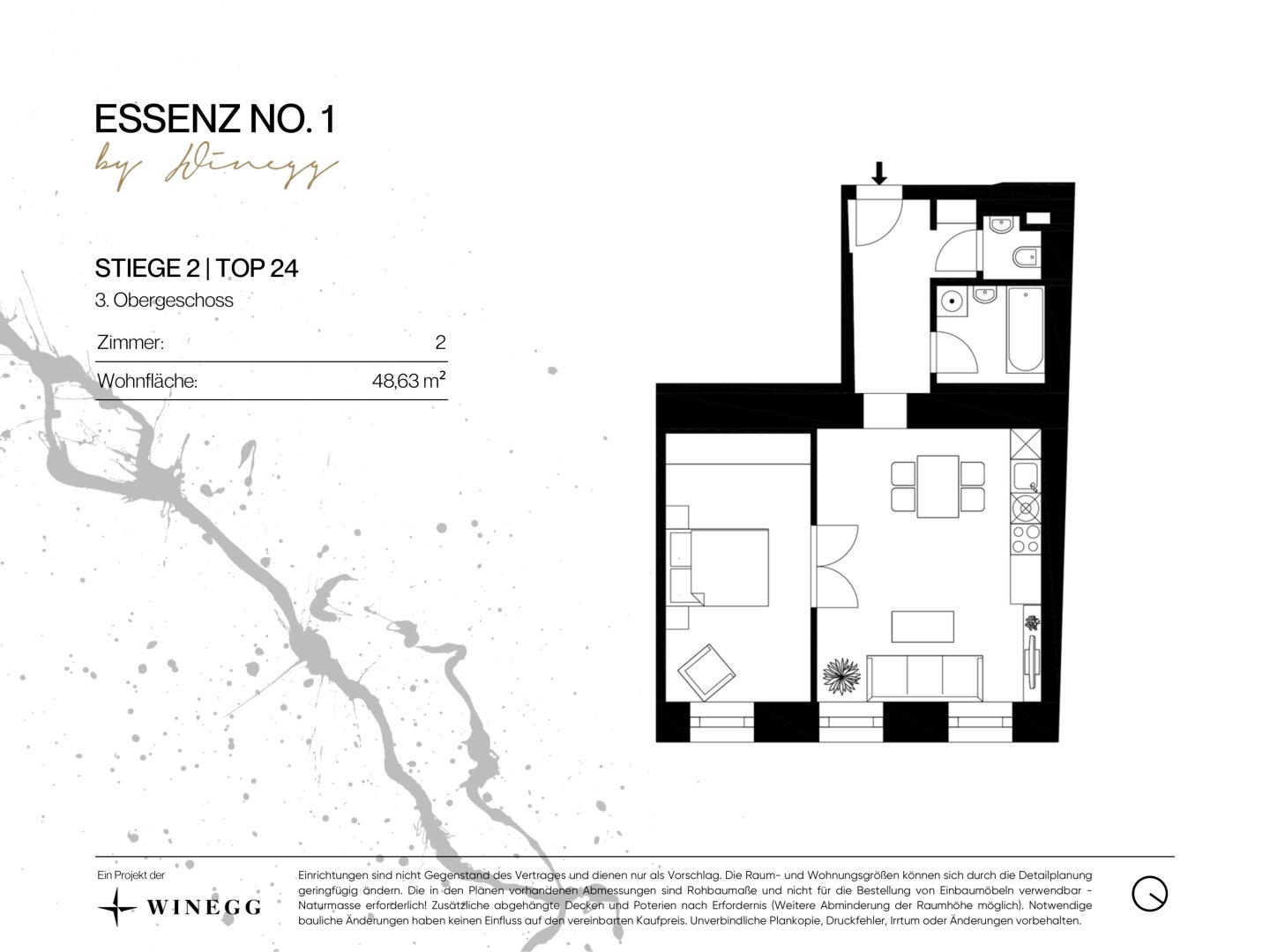 Die 2-Zimmer-Wohnung befindet sich im 3. Obergeschoss und bietet eine Wohnfläche von ca. 49 m². Die Raumaufteilung gliedert sich wie folgt: