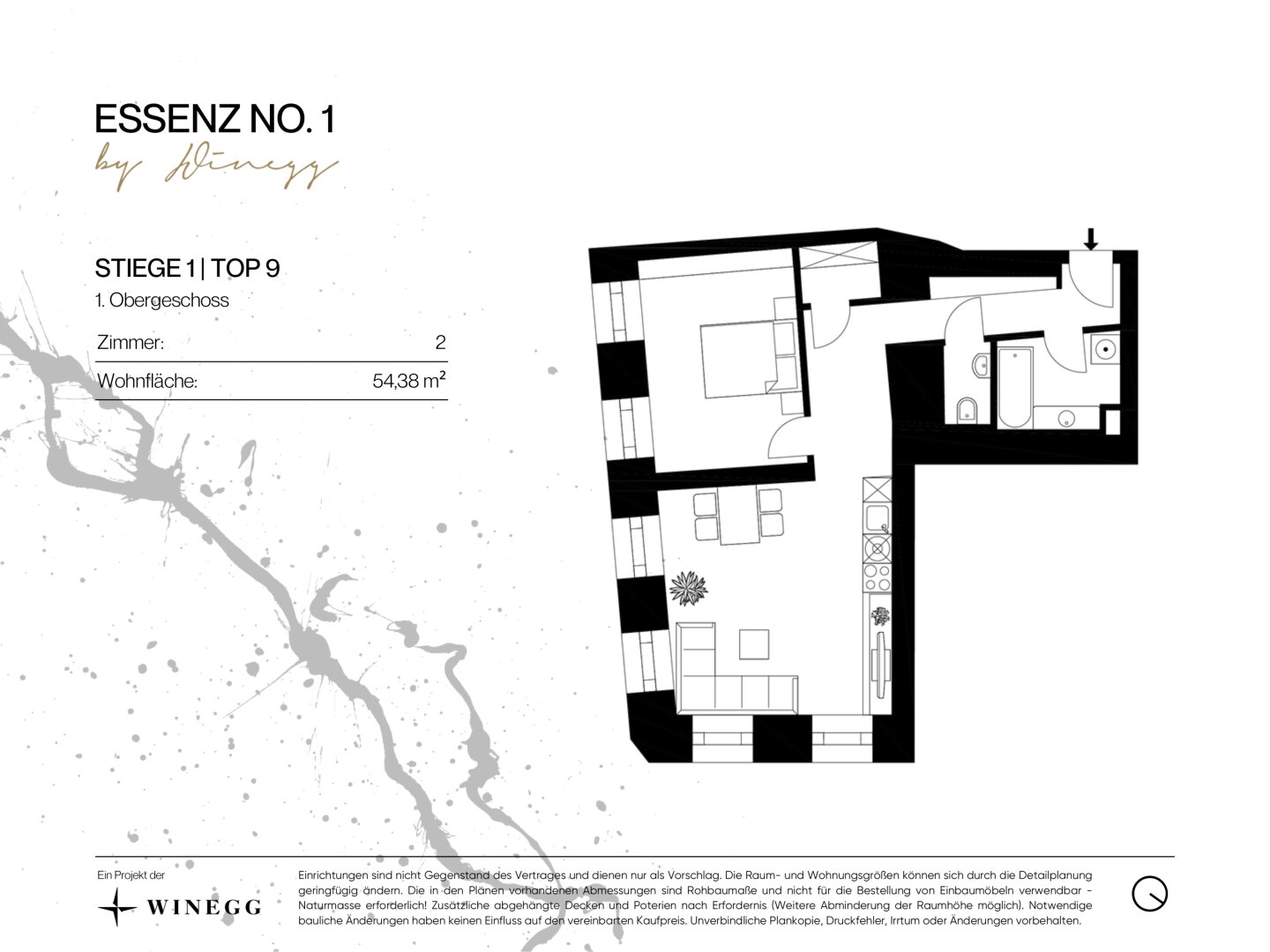Die 2-Zimmer-Wohnung befindet sich im 1. Obergeschoss und bietet eine Wohnfläche von ca. 54 m². Alle Zimmer sind separat begehbar. Die Raumaufteilung gliedert sich wie folgt: