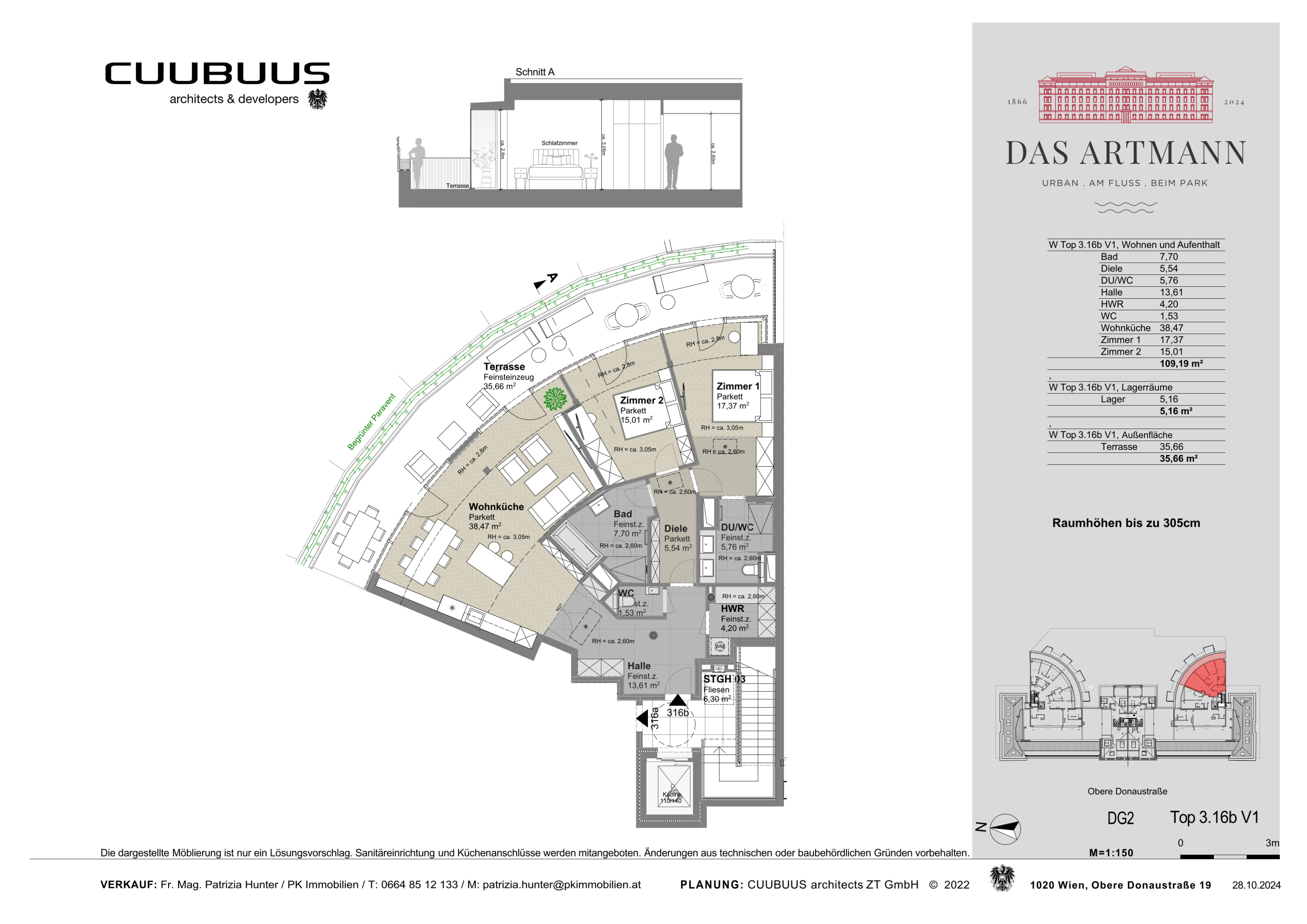 In den Regelgeschoßen entstehen Wohnungen mit einer Wohnnutzfläche von 41 m² bis 132 m², in den Dachgeschoßen finden sich Einheiten zwischen 41 m² und 166 m², bis hin zu den vier Penthäusern: zwei mit jeweils 153 m² (+ 85 m² Terrasse), zwei mit jeweils 288 m² Wohnnutzfläche (+ 120 m² Terrasse). Das Erdgeschoß ist für Gewerbe vorgesehen.