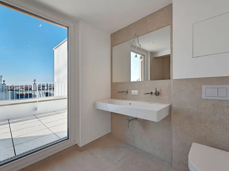 Das Penthouse mit 4 Zimmern befindet sich im 2. Dachgeschoss mit eigenem Liftzugang und bietet eine Wohnfläche von ca. 136 m² auf einer Ebene, zwei Terrassen (14 und 12 m²) sowie eine Dachterrasse (56 m²) mit traumhaftem Stadtblick. Die Raumaufteilung gliedert sich wie folgt: