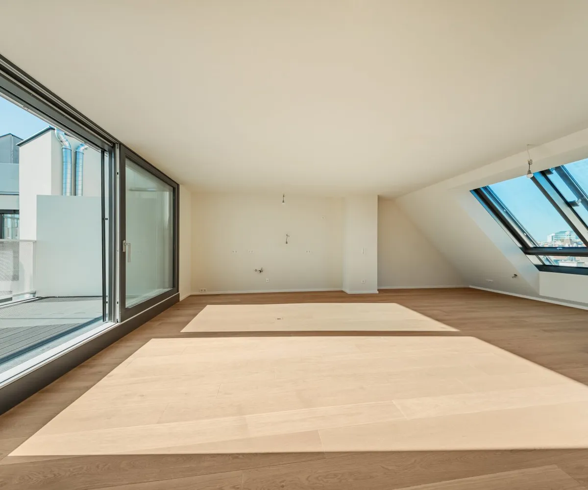 Die großzügige 4-Zimmer-Wohnung befindet sich im 2. Dachgeschoss und bietet eine Wohnfläche von ca. 152 m² sowie eine Terrasse mit ca. 12 m² und eine private Dachterrasse mit ca. 55 m². Die Raumaufteilung gliedert sich wie folgt: