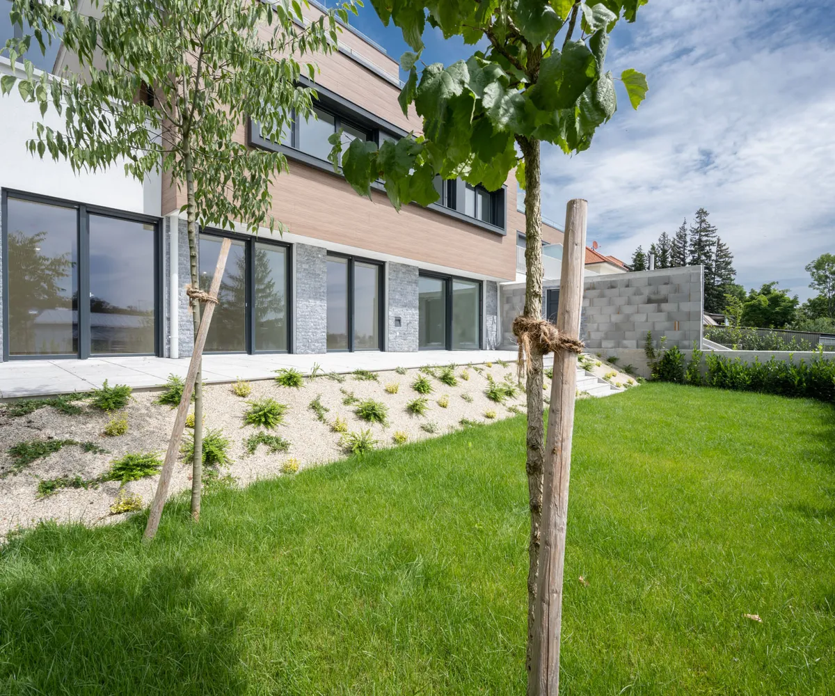 Großzügige, private Freiflächen sowie großflächige Fenster lassen das Tageslicht herein und verleihen ein helles, einladendes Ambiente. Hochwertige Holzböden sowie eine behagliche Fußbodenheizung sorgen für maximalen Wohnkomfort zu jeder Jahreszeit. Die modernen Bäder und die Niedrigenergiebauweise garantieren nicht nur höchsten Wohnstandard, sondern auch eine nachhaltige Lebensweise.