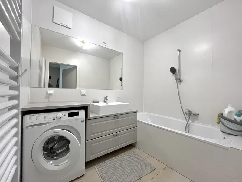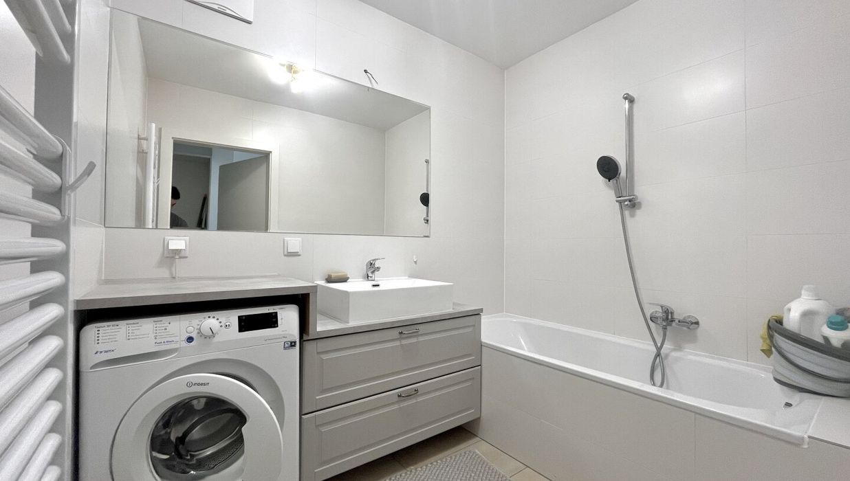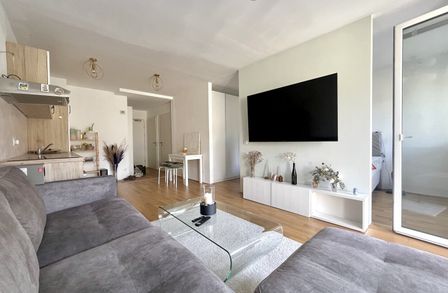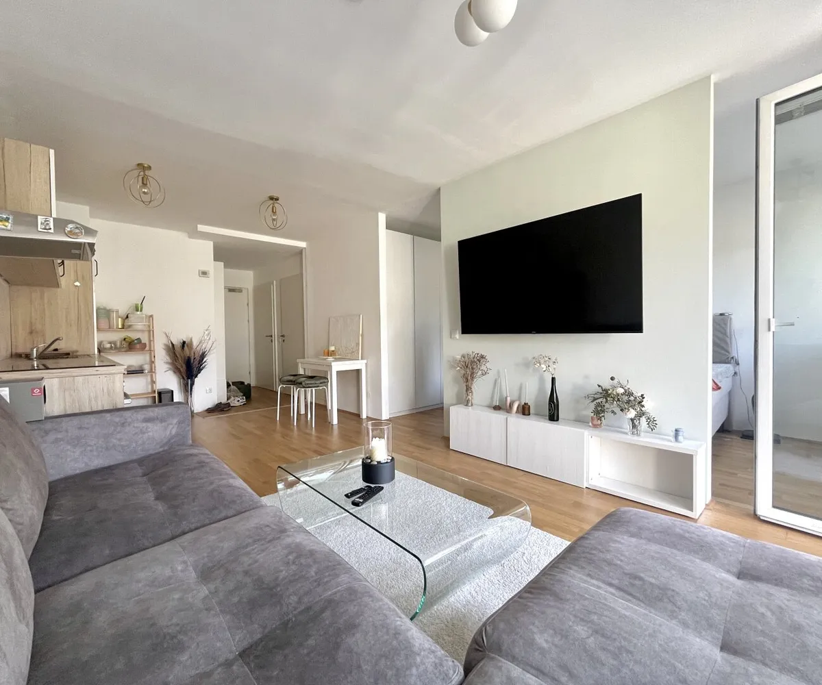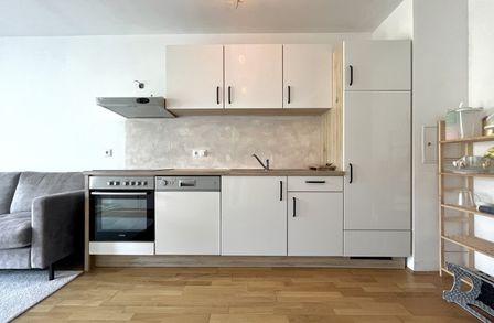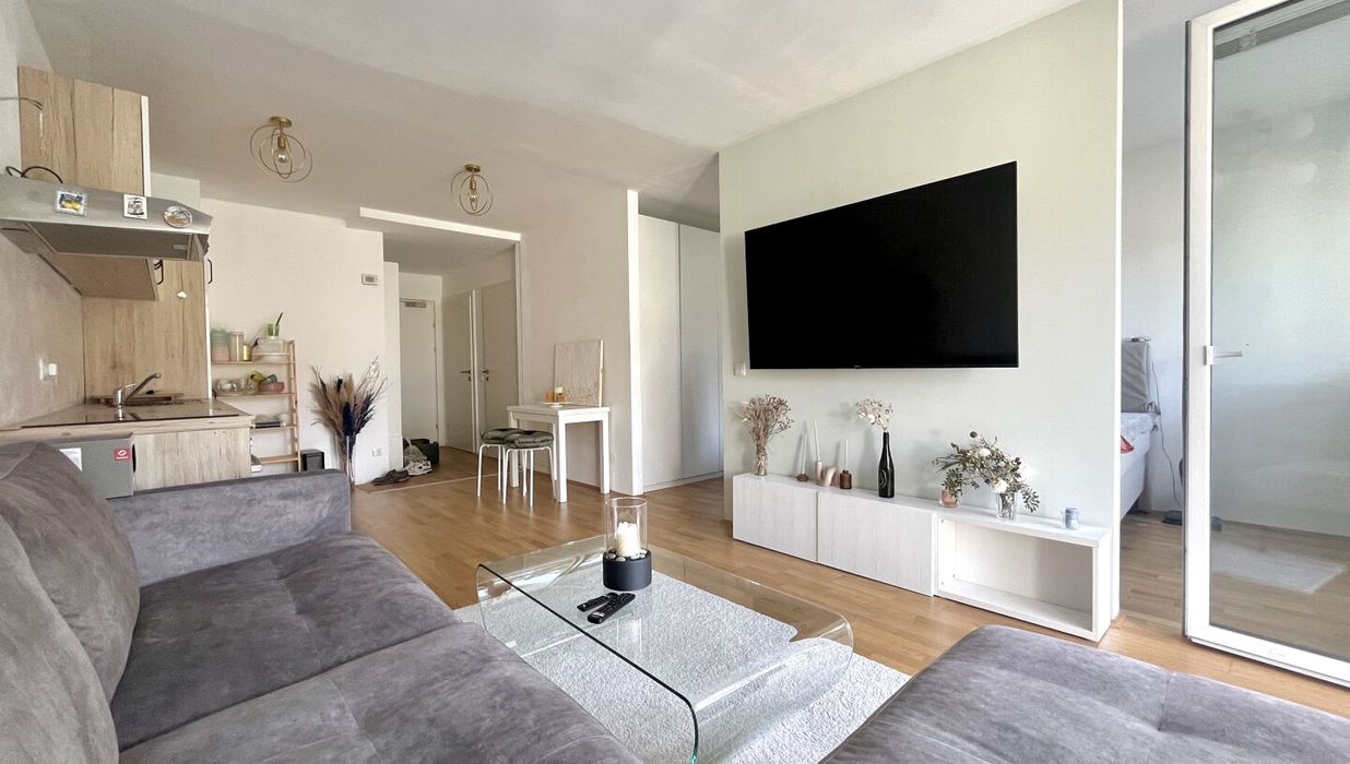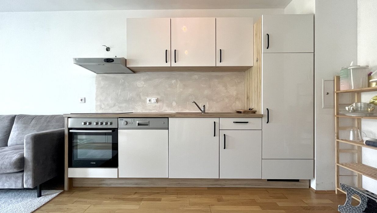 Die moderne Küche ist nahtlos mit dem Wohnzimmer verbunden, was eine einladende Wohnküche schafft – ideal für gesellige Zusammenkünfte mit Freunden und Familie. Das Schlafzimmer ist elegant durch eine Rigipswand abgetrennt, wodurch Privatsphäre und Ruhe gewährleistet sind.