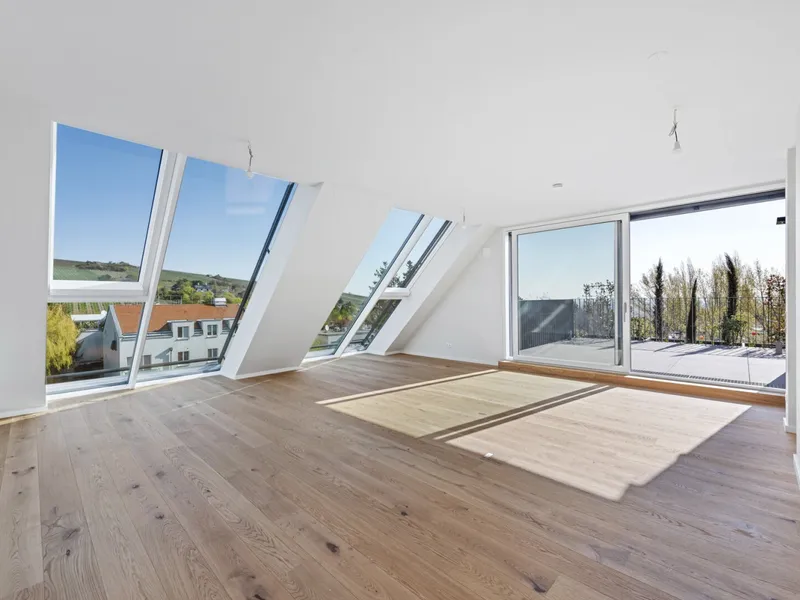 Auf der einen Seite befindet sich das lichtdurchflutete ca. 51 m² große Wohnzimmer, von wo aus Sie einen wunderbaren Weitblick in die Weinberge genießen können. Direkt gegenüber ist die offene Küche situiert, welche ca. 22 m² umfasst. Durch die südliche Ausrichtung fällt viel Tageslicht in diesen geräumigen Bereich.