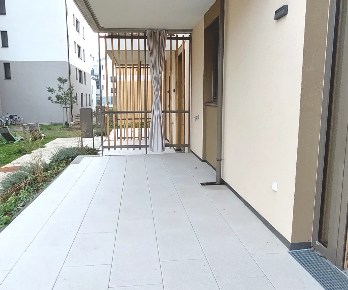 Sämtlichen Erdgeschoßwohnungen sind private Terrassen bzw. Eigengärten zugeordnet, die sich durch die Geländegestaltung und niedrige Gartenmauern von den umliegenden, allgemeinen Außenanlagen abheben. Zwischen benachbarten Balkonen und Terrassen