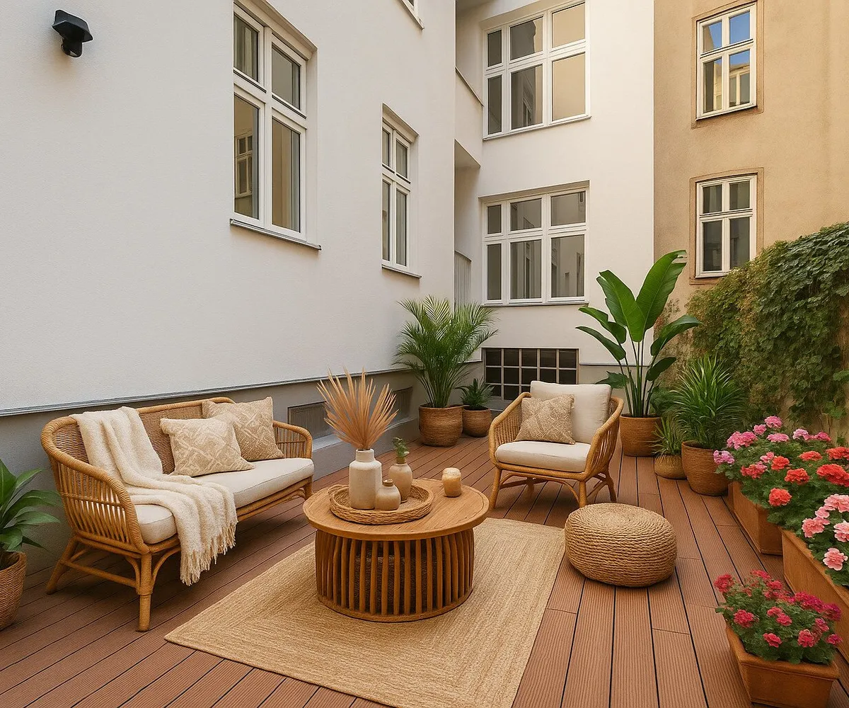 Dieser Wohneinheit ist ein privater Hofanteil im Ausmaß von rund 20 qm zugeordnet, den Sie nach Wunsch gestaltet können. Der Zugang ins Freie erfolgt über den Vorraum bzw. die Loggia. Vom Verkäufer wird eine Treppe in den Innenhof errichtet sowie ein hübscher Bodenbelag verlegt und ein ca. 2 m hoher Zaun als Sichtschutz errichtet.