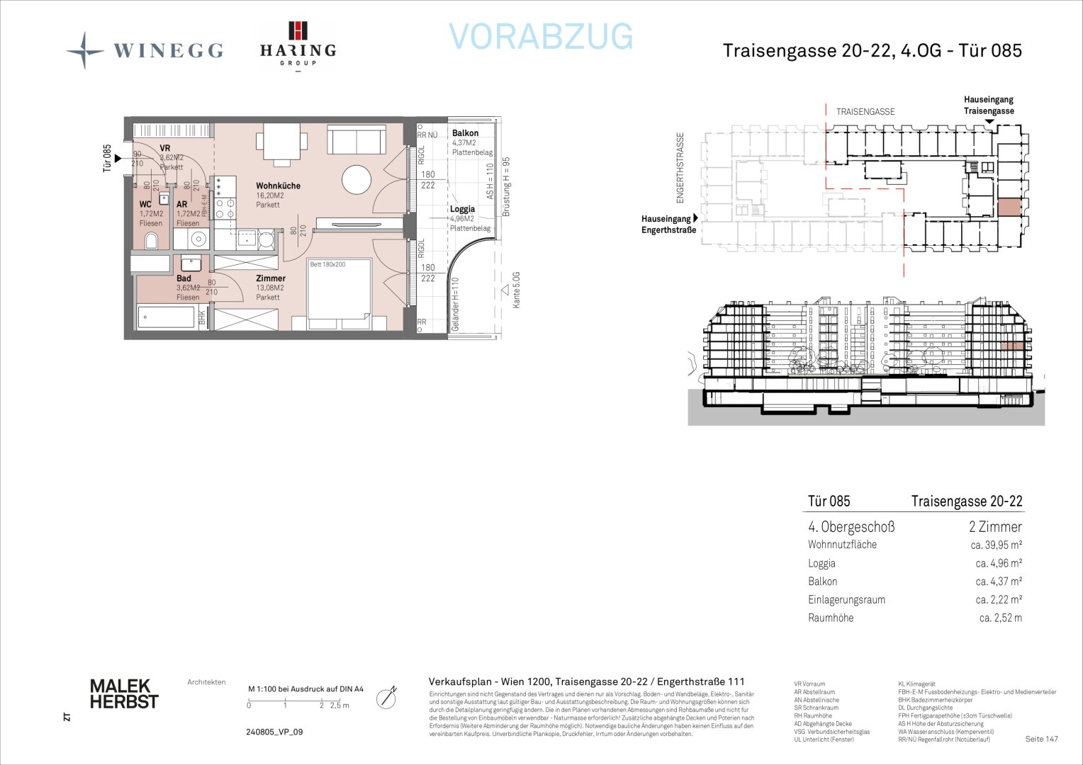 In der Traisengasse 20–22 vereinen sich Ästhetik und Funktionalität in jeder Wohneinheit. Mit intelligenten Grundrissen, die von gemütlichen Einzimmerapartments bis zu großzügigen Vierzimmerwohnungen reichen, finden hier alle ihren idealen Lebensraum. Eichenparkettböden und stilvolle Markenfliesen veredeln das Interieur, während die Fußbodenheizung, gespeist durch umweltfreundliche Fernwärme, für ein behagliches Raumklima sorgt. Außenliegender, elektrischer Sonnenschutz und Klimaanlagen in den Dachgeschoßwohnungen gewährleisten ein angenehmes Wohnambiente, selbst an den heißesten Tagen.