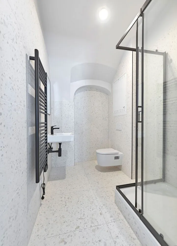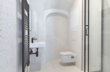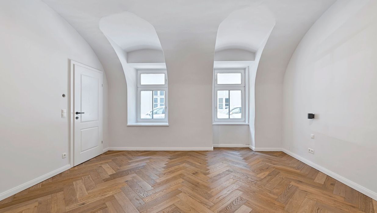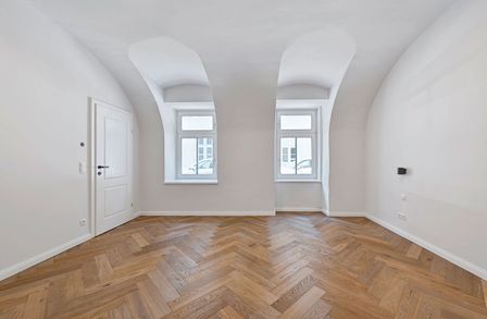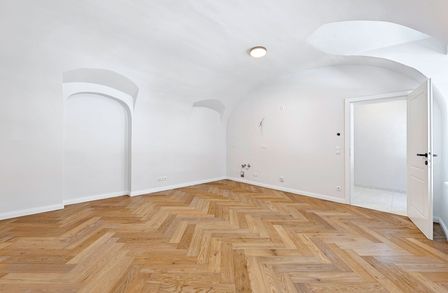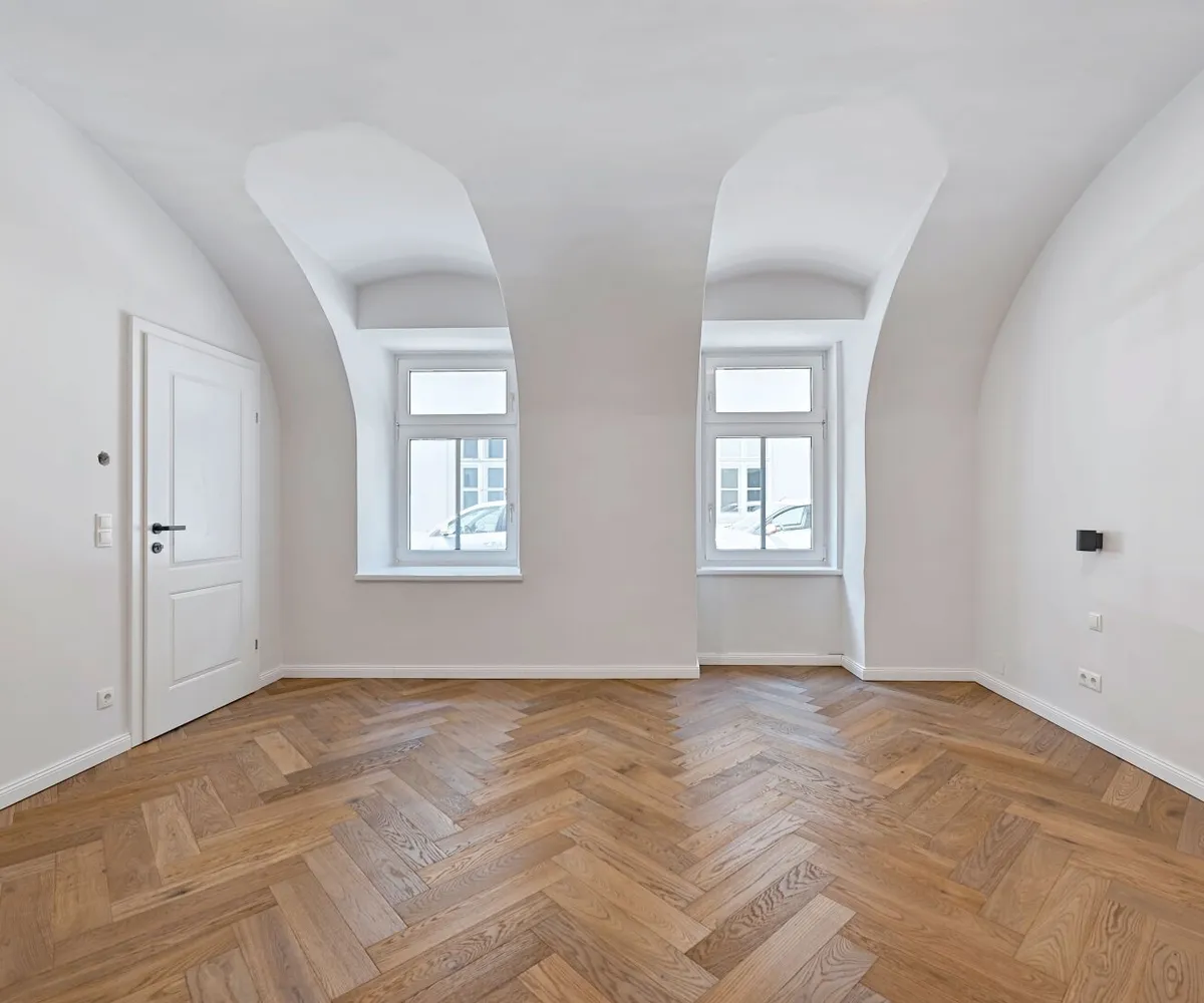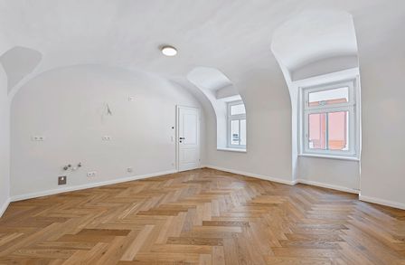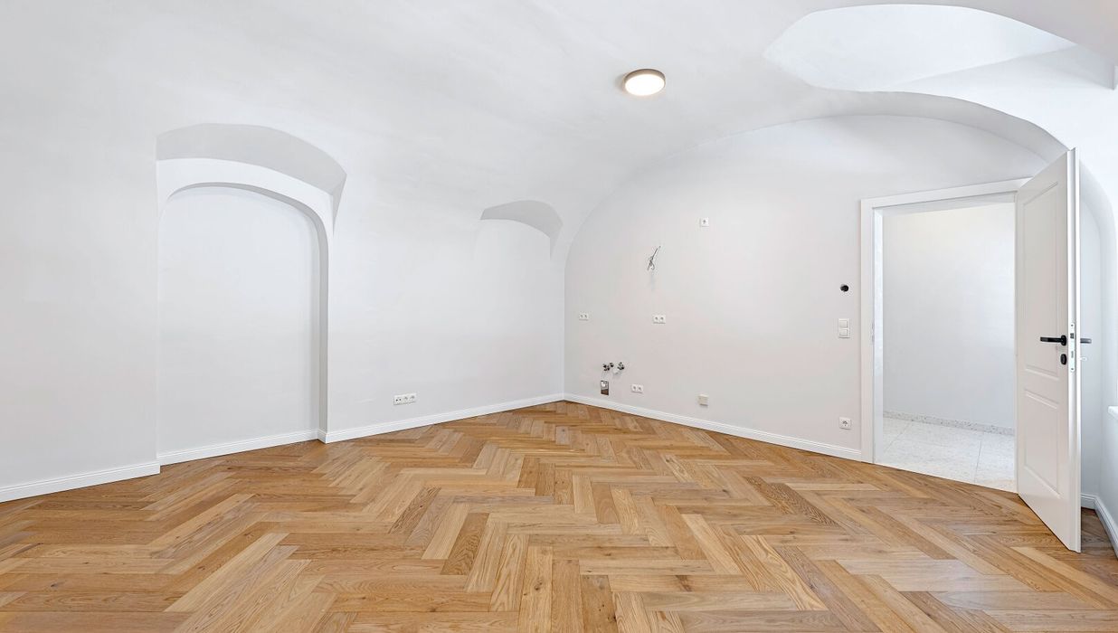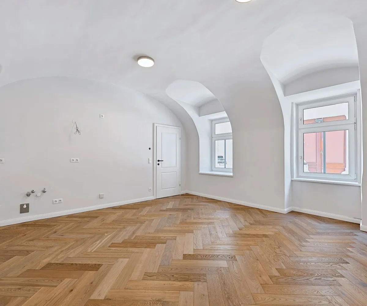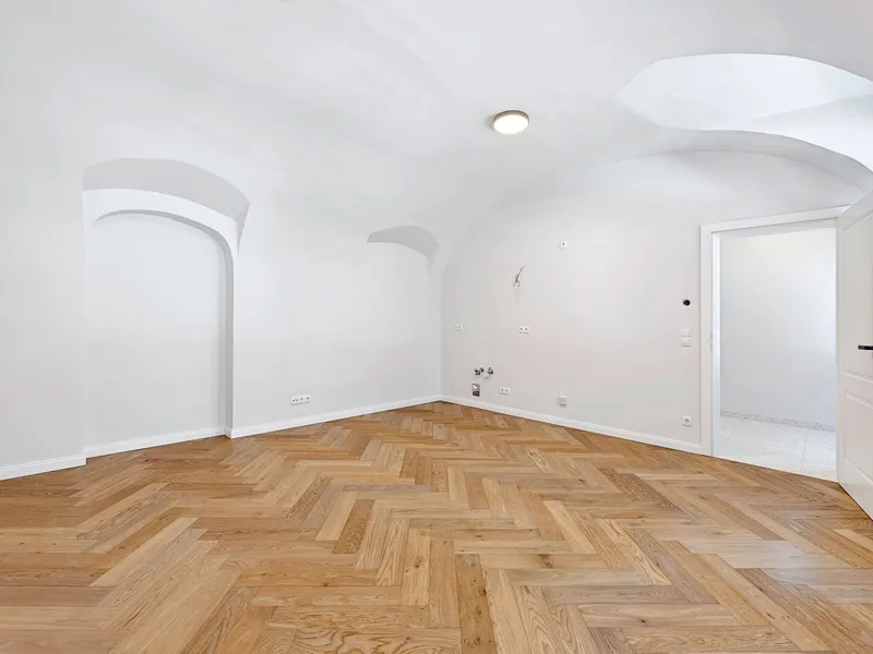 Über den gefliesten Vorraum mit Platz für eine Garderobe, gelangt man in das moderne Badezimmer und das gemütliche Wohn-/Schlafzimmer mit ca. 22 qm. Das Bad bietet Platz für eine Dusche, ein WC, ein Handwaschbecken sowie einen Handtuchheizkörper. Der Wohnraum verleiht durch seine charmante Gewölbedecke und behaglichem Eichenparkett ein angenehmes Wohngefühl. Die Raumhöhe beträgt ca. 3 m.
