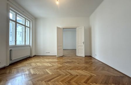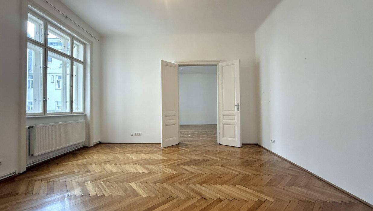 Die drei Wohnräume (Wohnzimmer, zwei Schlafzimmer, Kabinett) sind mit klassischem Fischgrätparkett ausgestattet, der gemeinsam mit den originalen Doppel-Holzkastenfenstern für zeitlose Eleganz und ein authentisches Altbauflair sorgt. Die bis zu 3 Meter hohen Decken verleihen der gesamten Wohnung eine wohltuende Großzügigkeit und vermitteln ein luftiges, offenes Wohngefühl.