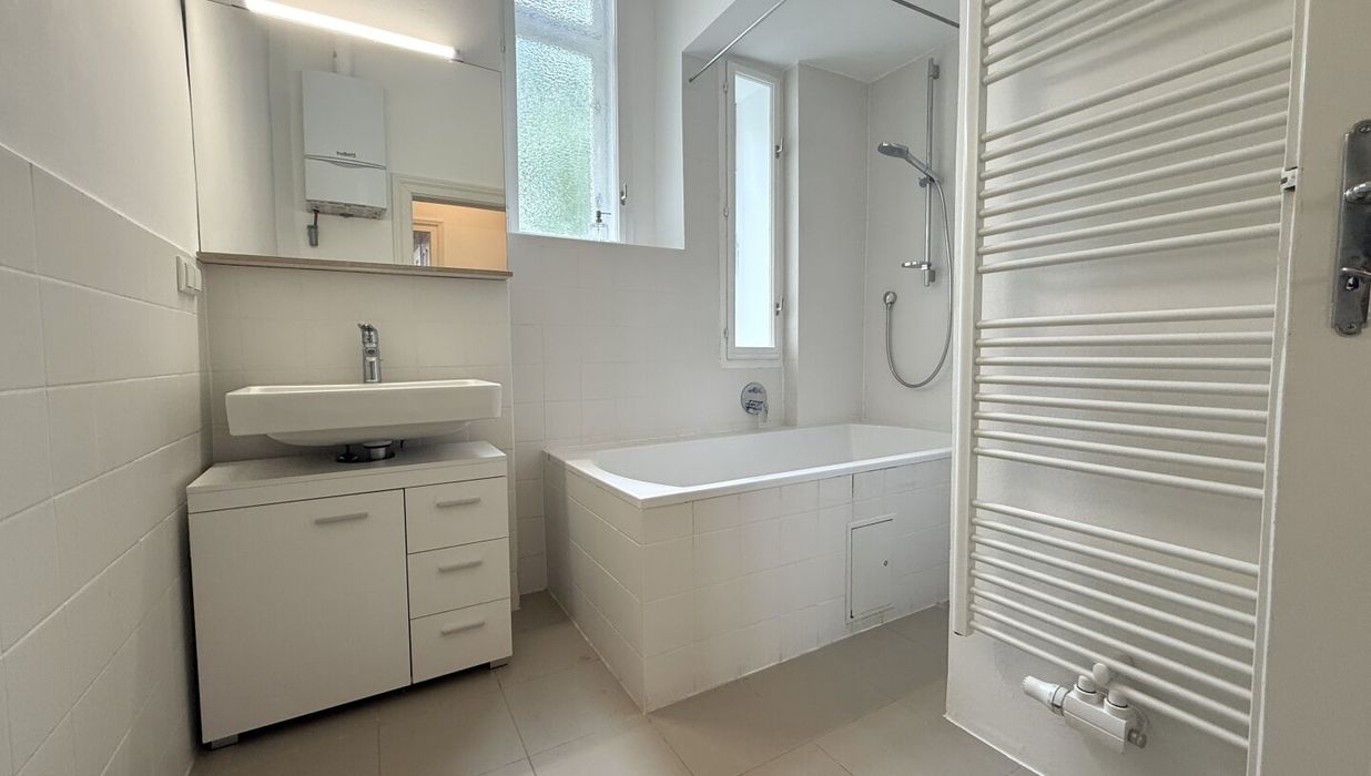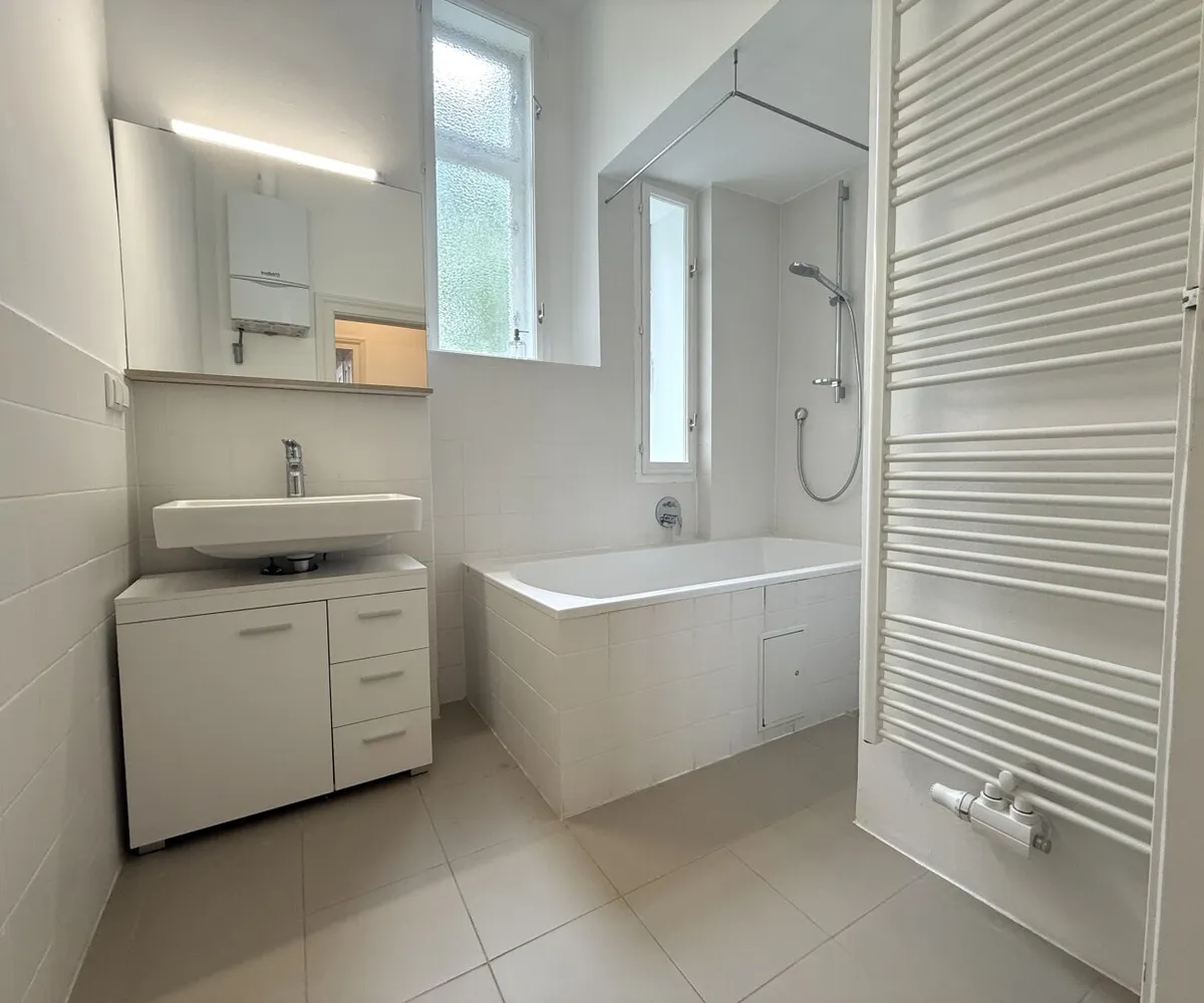 Ein weiteres Kabinett eignet sich ideal als Büro, Kinder- oder Gästezimmer. Der großzügige, separierte Küchenbereich mit Fenster und Blick in eine Baumkrone inspiriert zum Kochen und lädt zum Verweilen ein. Das Badezimmer mit Fenster sowie das WC sind getrennt voneinander angeordnet – ein weiterer Pluspunkt in Sachen Wohnkomfort und Alltagstauglichkeit.