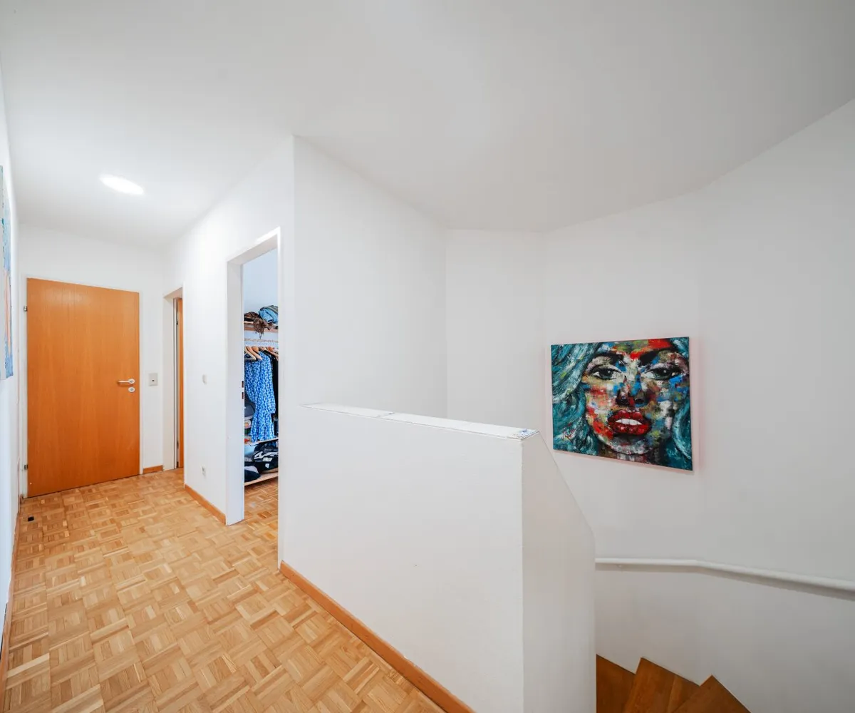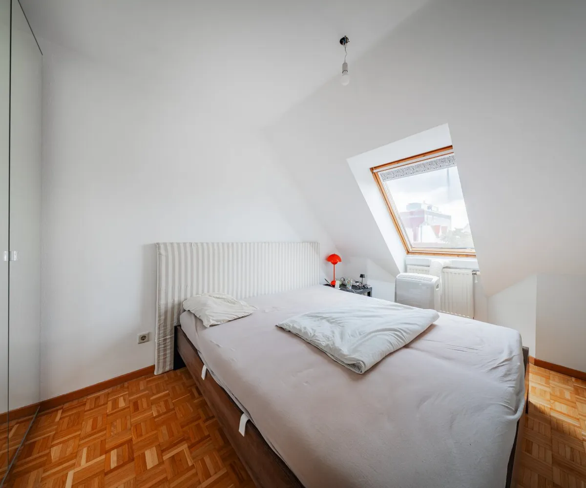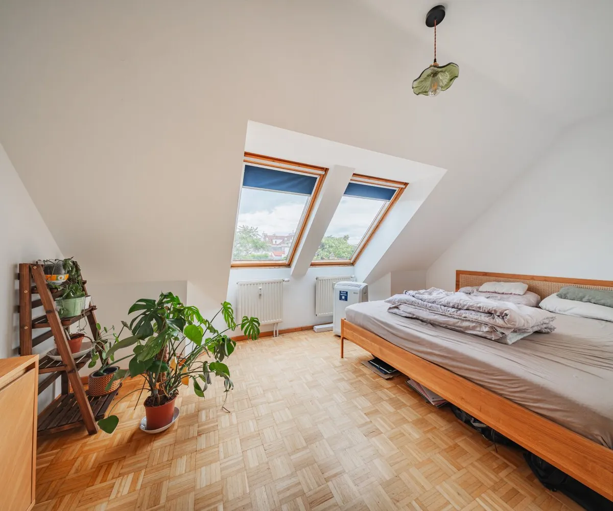 beherbergt derzeit zwei Schlafzimmer mit großen, drehbaren Dachflächenfenstern – die den Blick in die grünen Baumwipfel aus dem Bett garantieren, ein Badezimmer mit Wanne und WC sowie einen weiteren Abstellraum, der zuletzt als Büro genutzt wurde.
