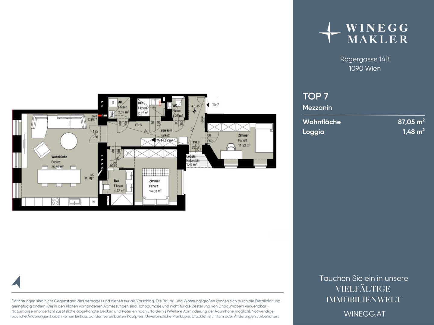 Der Drei-Zimmer-Erstbezug mit ca. 87 qm Wohnfläche zzgl. ca. 1,5 qm Loggia befindet sich im Mezzanin und ist straßen- sowie hofseitig ausgerichtet.