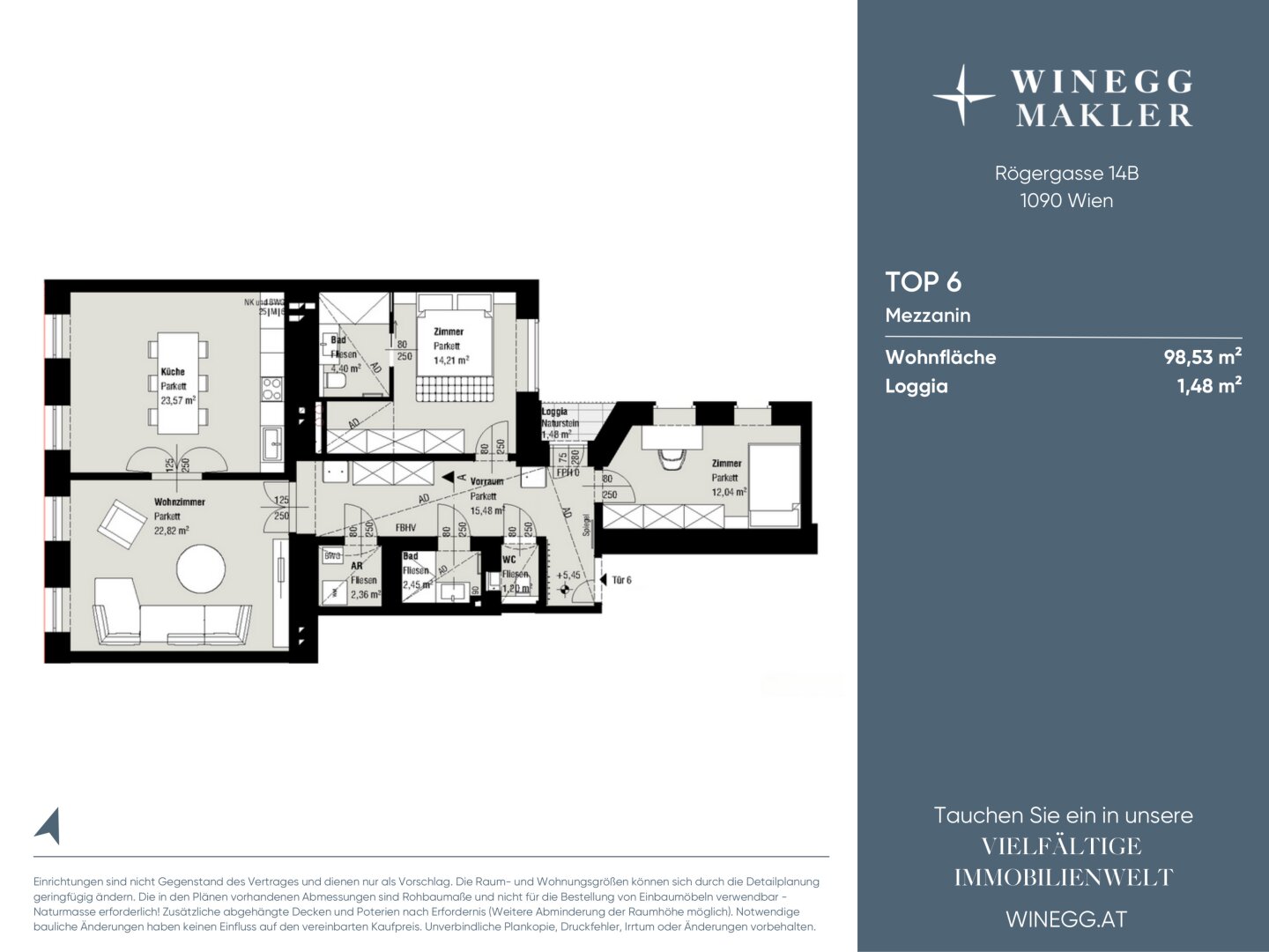 Der Drei-Zimmer-Erstbezug mit ca. 99 qm Wohnfläche zzgl. ca. 1,5 qm Loggia befindet sich im Mezzanin und ist straßen- sowie hofseitig ausgerichtet.
