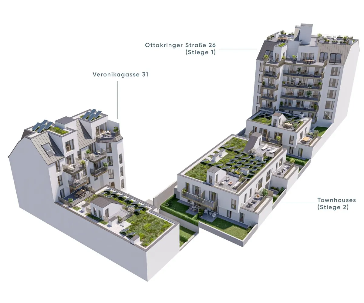 Inmitten des 17. Bezirks entsteht ein Wohnensemble, das moderne Lebensqualität in den Mittelpunkt stellt. In der Ottakringer Straße 26 / Veronikagasse 31 bieten 60 Eigentumswohnungen , verteilt auf 2 Wohnhäuser und 1 Townhouse im begrünten Innenhof, einen Ort für zukunftsweisendes Wohnen. Das Wohnprojekt zeichnet sich durch eine ansprechende Architektur, eine hochwertige Ausstattung und eine einmalige Lage aus. Mit einem begrünten Innenhof und nachhaltigen Energielösungen wird ein Zeichen für Nachhaltigkeit gesetzt. Das Grätzl präsentiert sich als offen und urban mit vielfältigen Möglichkeiten für alle, die nach einem aufregenden und gleichzeitig entspannten Wohnstandort streben.