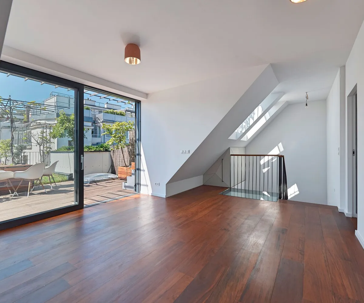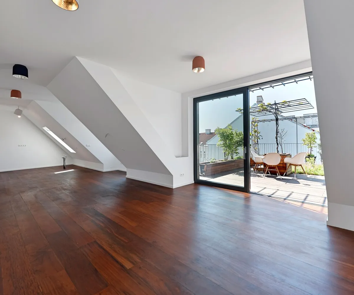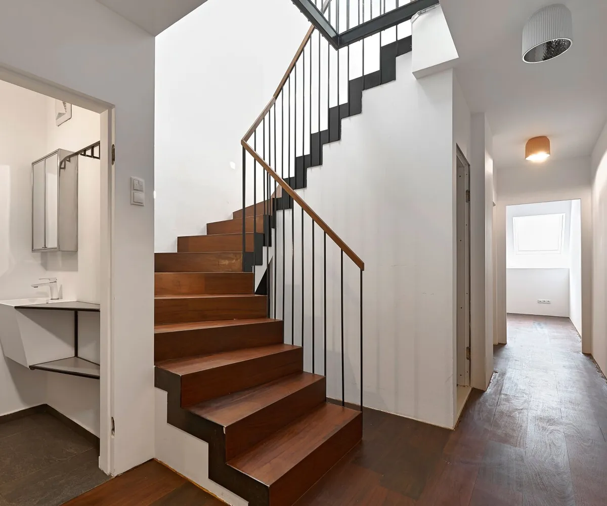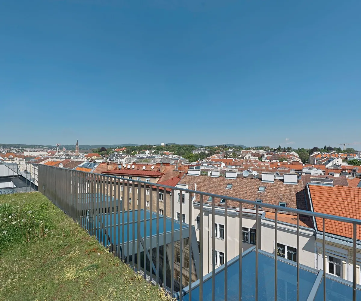 Über eine außenliegende Treppe gelangt man von der Terrasse auf der Wohnebene schließlich auf die darüber liegende Dachterrasse im Ausmaß von ca. 57,90 m² und mit atemberaubendem Fernblick.