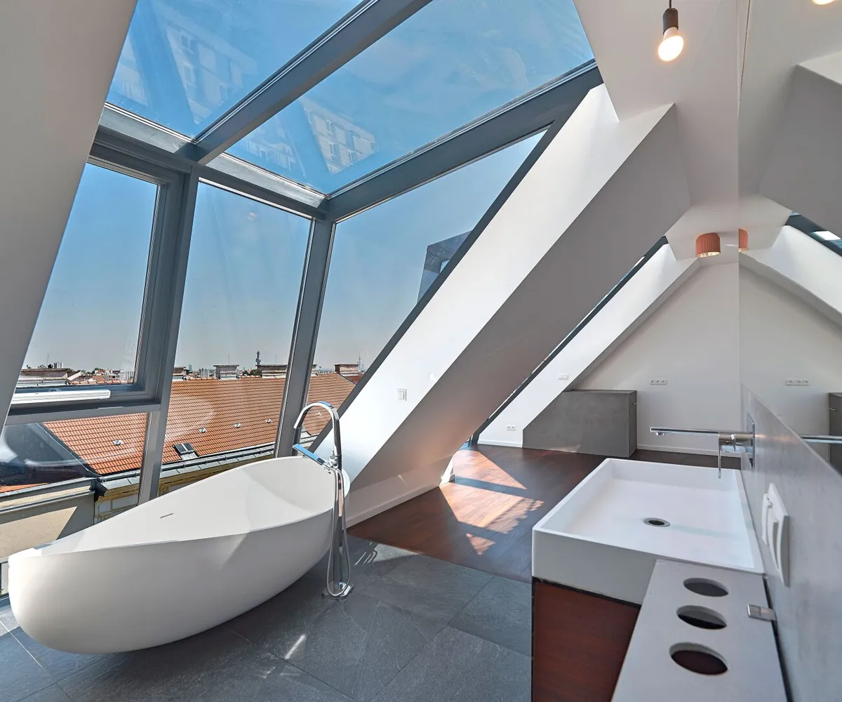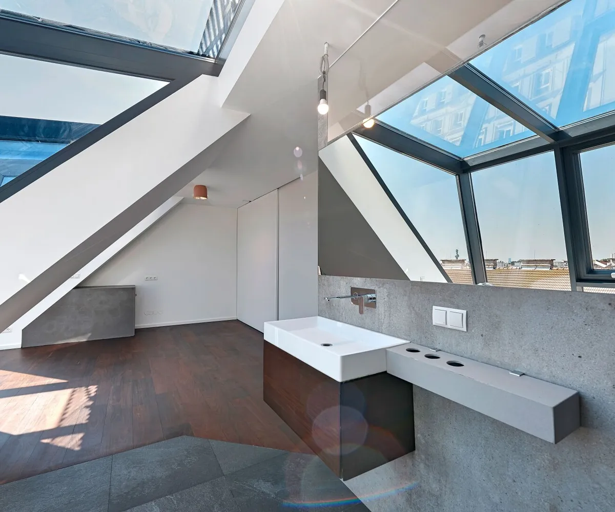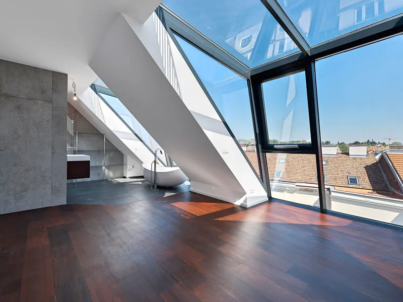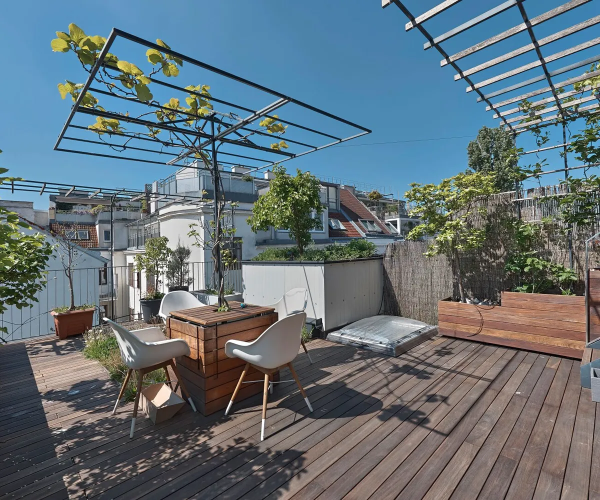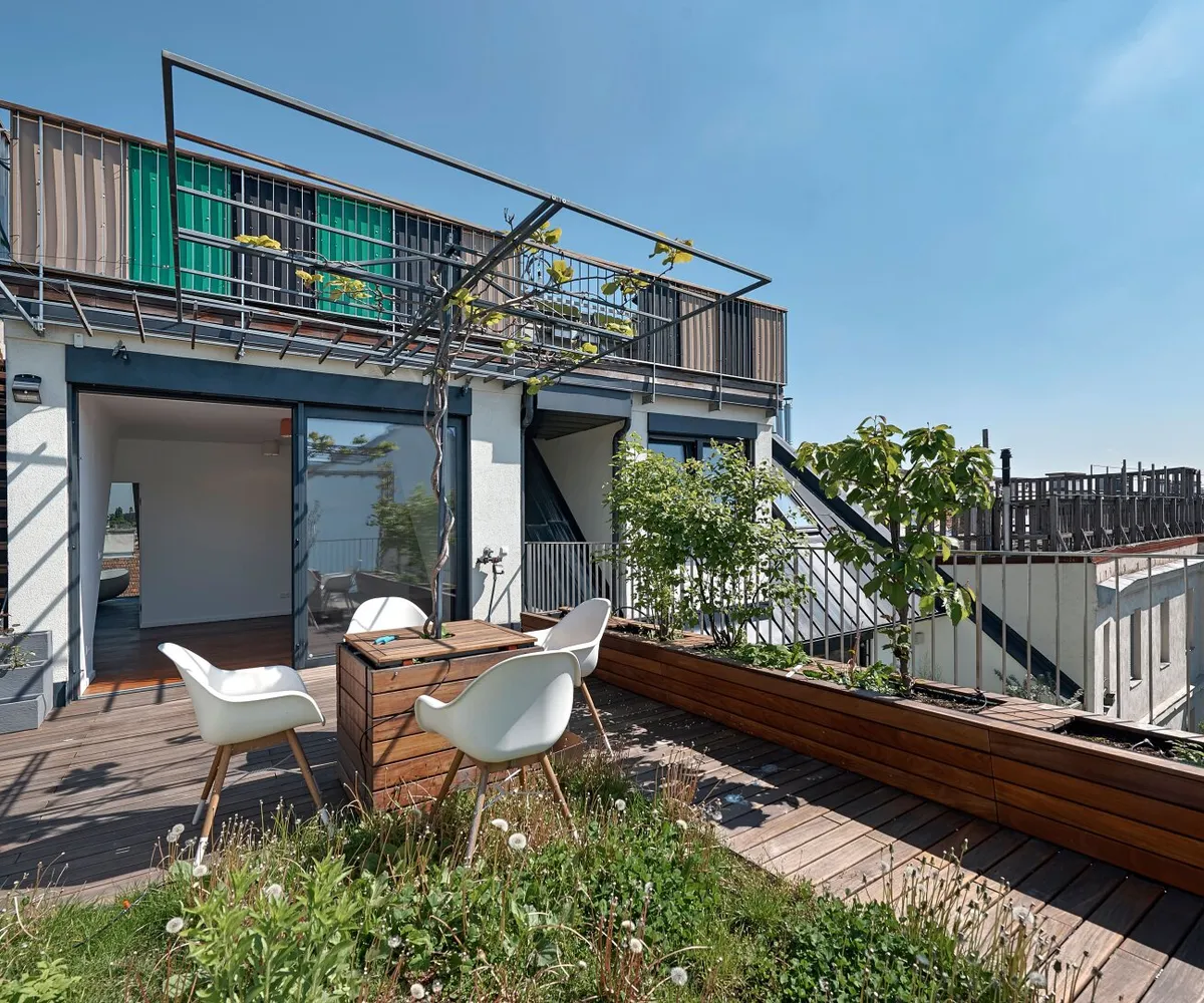 Über eine außenliegende Treppe gelangt man von der Terrasse auf der Wohnebene schließlich auf die darüber liegende Dachterrasse im Ausmaß von ca. 57,90 m² und mit atemberaubendem Fernblick.