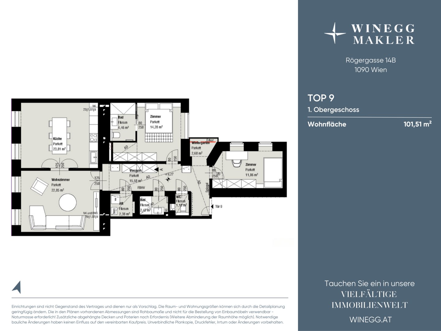 Der wunderschön sanierte Drei-Zimmer-Erstbezug mit ca. 101,5 qm Wohnfläche befindet sich im 1. Stock und ist straßen- sowie hofseitig ausgerichtet.