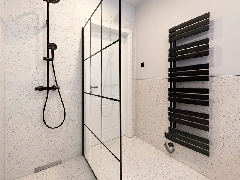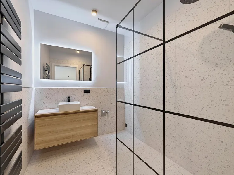 Über den Vorraum gelangt man in die geräumige Wohnküche im Ausmaß von ca. 29,5 qm. Hofseitig angrenzend befindet sich der Balkon und straßenseitig das Schlafzimmer (ca. 18 qm) mit en Suite-Bad. Das moderne Badezimmer ist mit einer bodenebenen Dusche, einem Sporssenheizkörper, einem eleganten Waschtisch und einem Waschmaschinenanschluss ausgestattet. Das separate WC liegt beim Wohnungseingang.