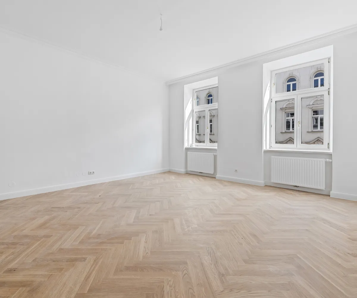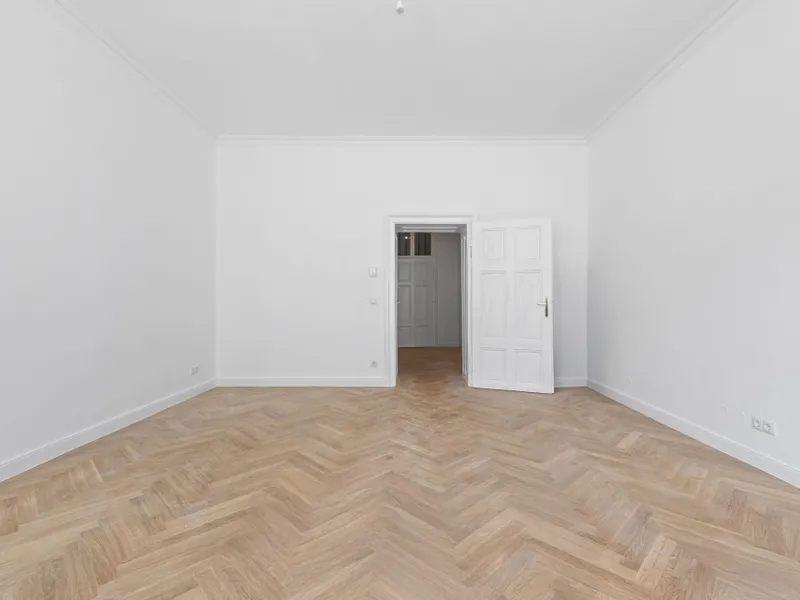 Besonderes Augenmerk wurde auch auf die Erhaltung und Aufwertung klassischer Altbauelemente in den Wohnungen gelegt. Die hohen Räume und der Fischgrätparkett schaffen eine Atmosphäre zeitloser Eleganz.
