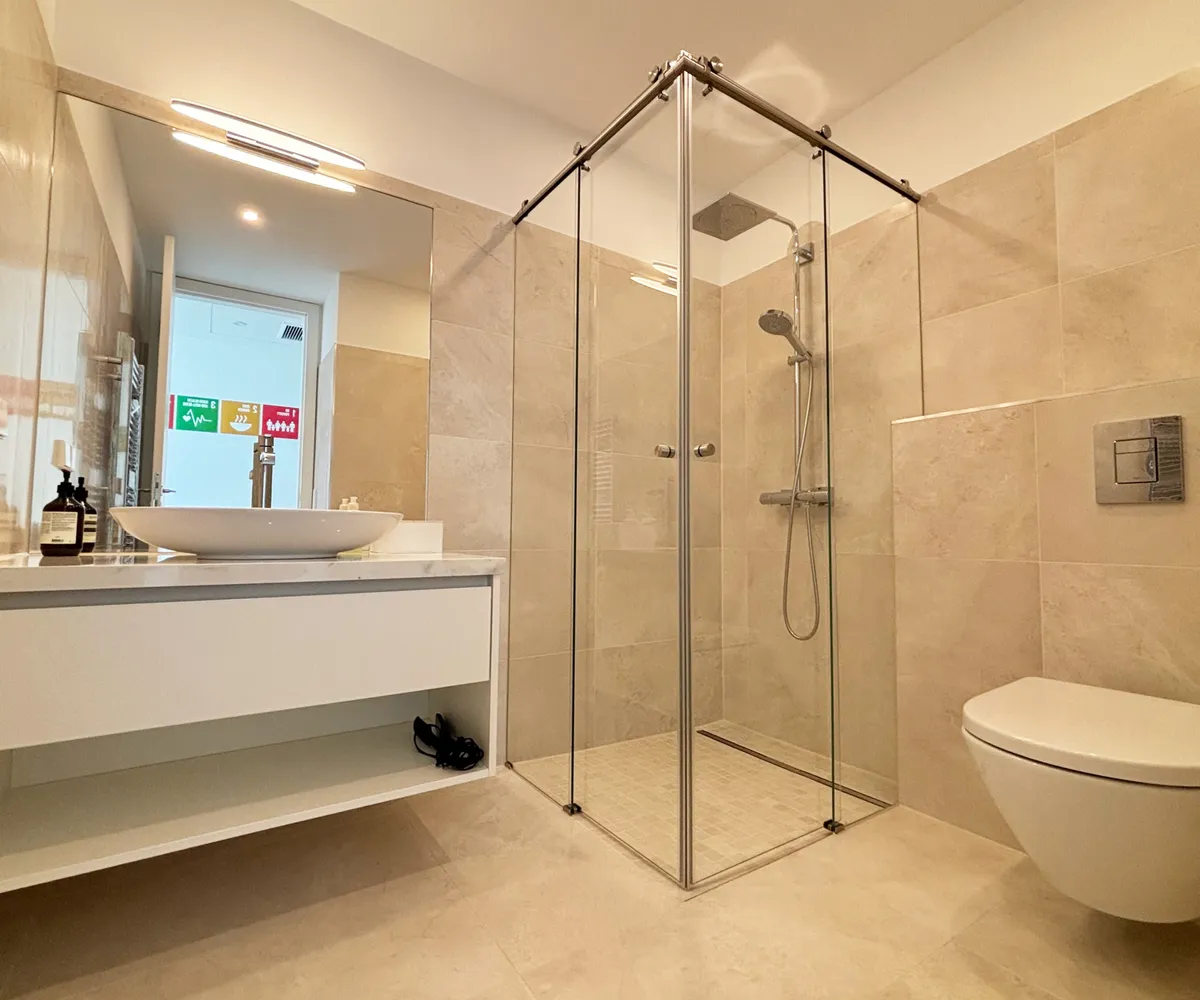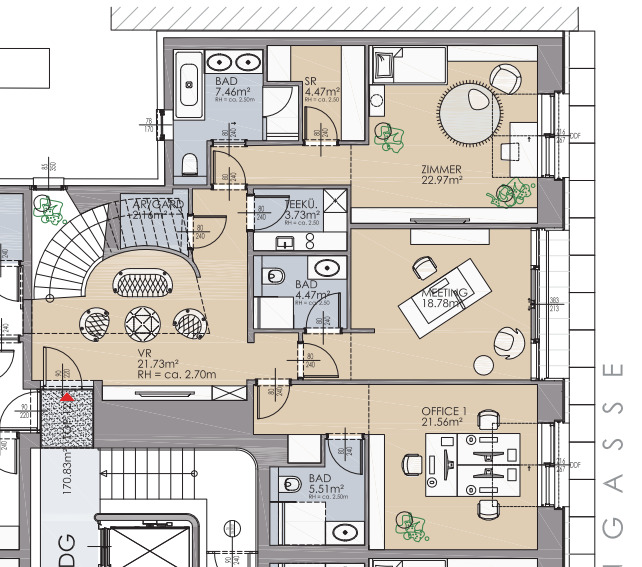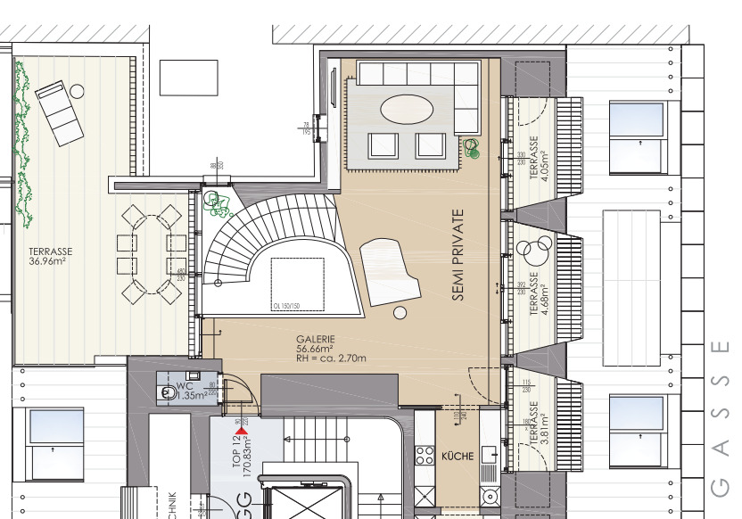 Die Wohnung erstreckt sich über das 1. und 2. Dachgeschoss und gliedert sich in eine großzügige Wohnküche mit vollausgestatteter Einbauküche, drei Schlafzimmer mit jeweils einem dazugehörigen Badezimmer, ausgestattet mit Dusche und/oder Badewanne und WC, einem Abstellraum sowie einem Vorraum. Die atemberaubende, westlich ausgerichtete Dachterrasse lädt zum Verweilen im Freien ein und rundet dieses Wohnerlebnis perfekt ab. Ergänzt wird das Angebot durch drei Terrassen, die einen direkten Blick auf die Wiener Staatsoper sowie den Stephansdom bieten – ein einzigartiges Highlight im Herzen der Stadt.