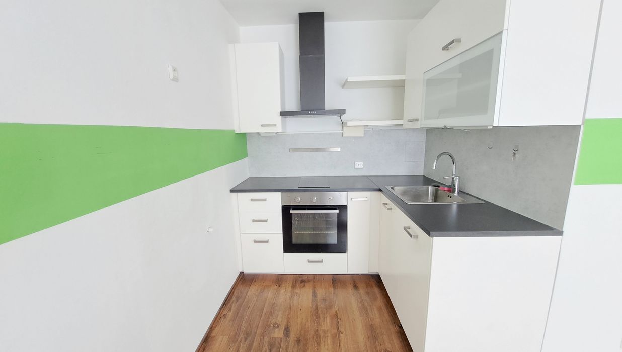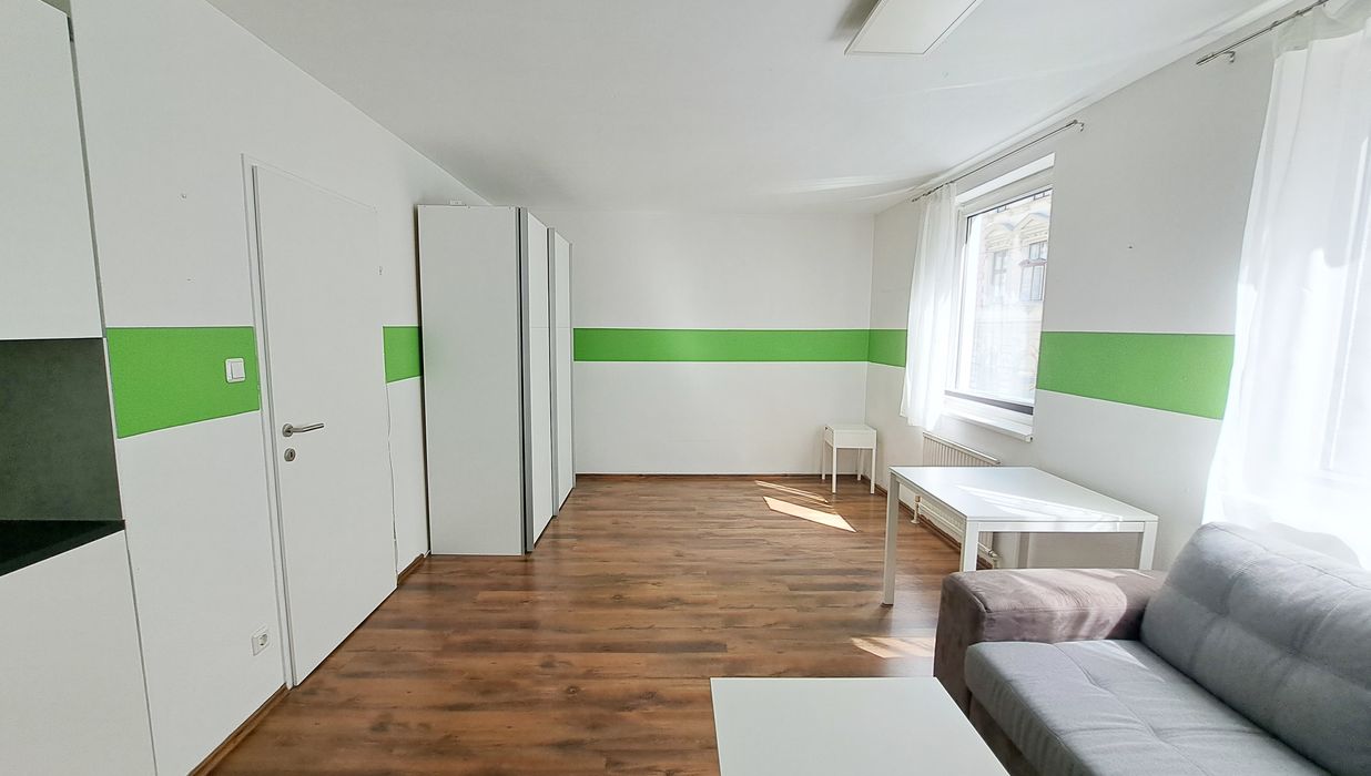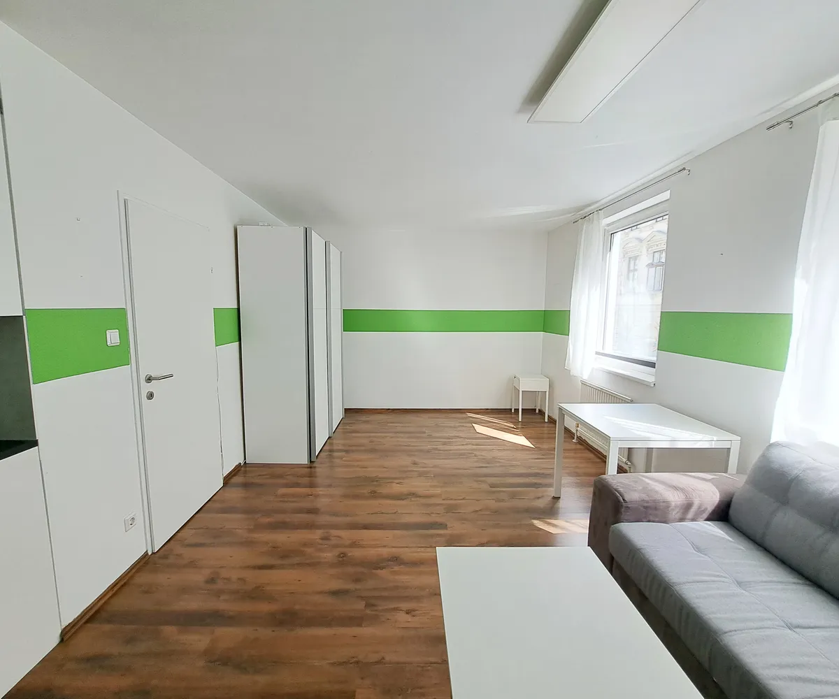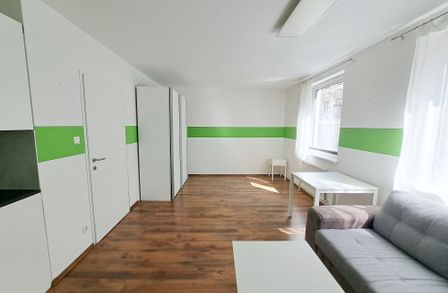 Über den Vorraum gelangt man in das Badezimmer, welches über eine Dusche, Toilette, Waschtisch samt Unterschrank sowie einen großflächigen Spiegel inkl. Beleuchtung verfügt. Das Zimmer von knapp 24 m² bietet genügend Platz, um sich einen gemütlichen Wohn-Essbereich sowie eine kleine Schlafnische einzurichten. Die Küchenzeile beinhaltet eine kleine Herdplatte, Backrohr sowie einen Geschirrspüler. Ein Kühlschrank wäre noch zu ergänzen.