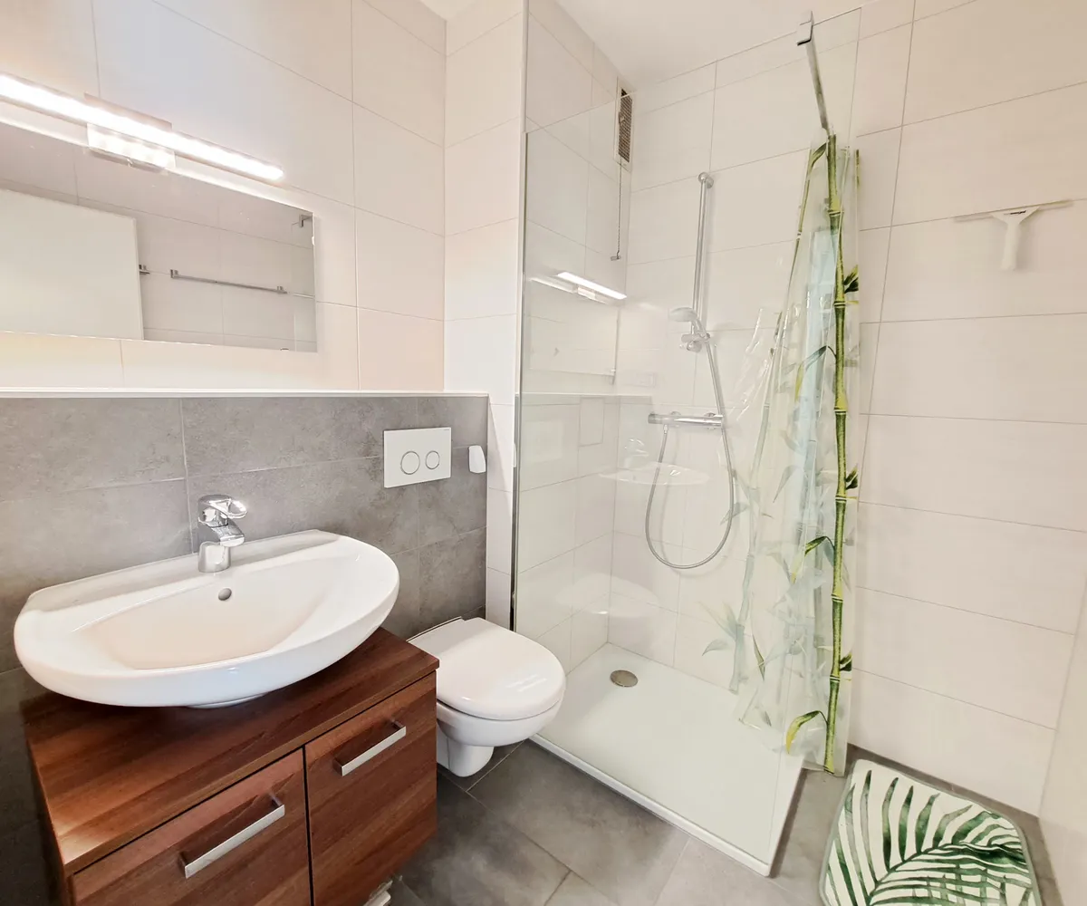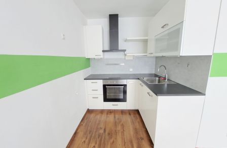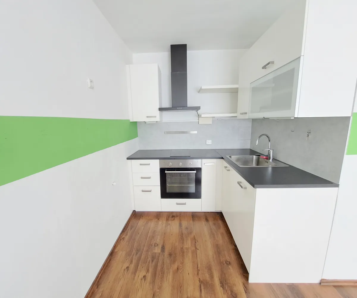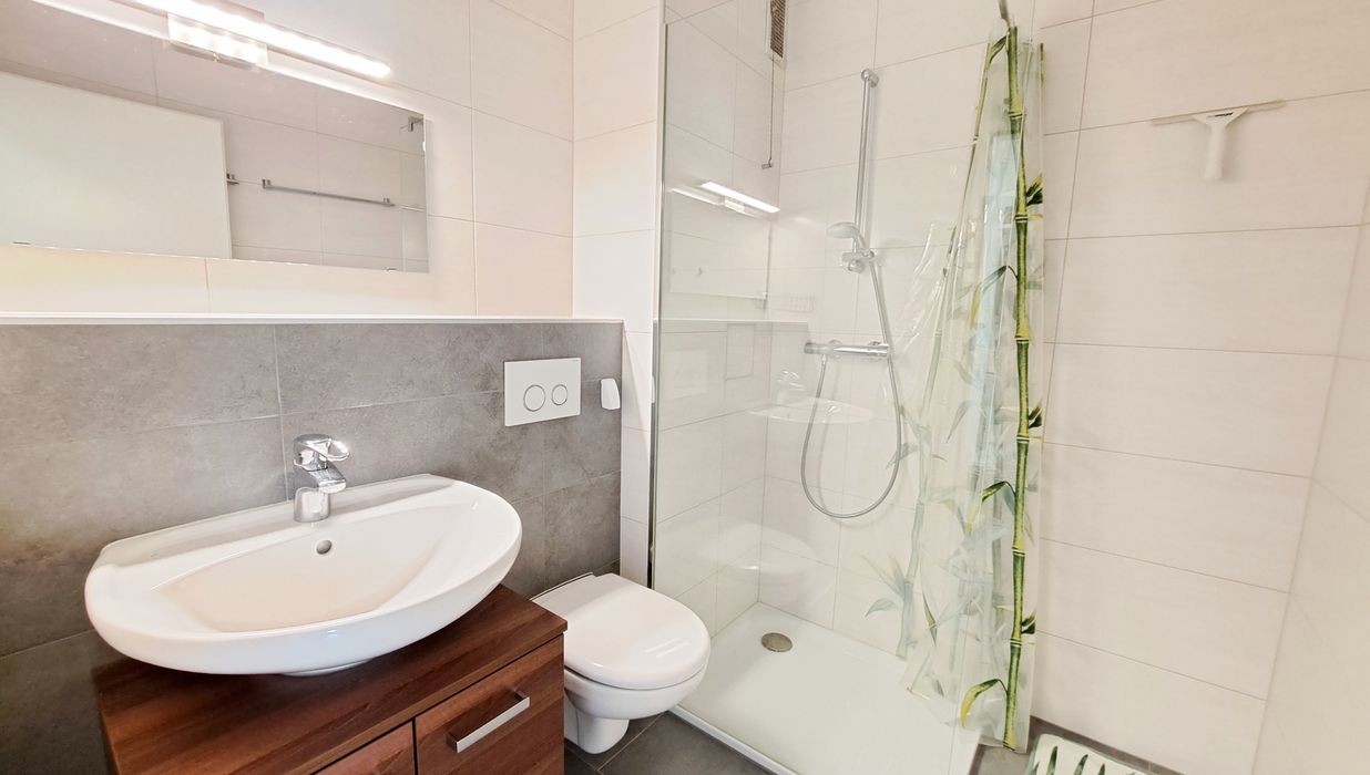 Über den Vorraum gelangt man in das Badezimmer, welches über eine Dusche, Toilette, Waschtisch samt Unterschrank sowie einen großflächigen Spiegel inkl. Beleuchtung verfügt. Das Zimmer von knapp 24 m² bietet genügend Platz, um sich einen gemütlichen Wohn-Essbereich sowie eine kleine Schlafnische einzurichten. Die Küchenzeile beinhaltet eine kleine Herdplatte, Backrohr sowie einen Geschirrspüler. Ein Kühlschrank wäre noch zu ergänzen.