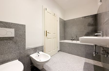 Edles Badezimmer mit Badewanne, Dusche, Waschbecken & hochwertiger Sanitärausstattung