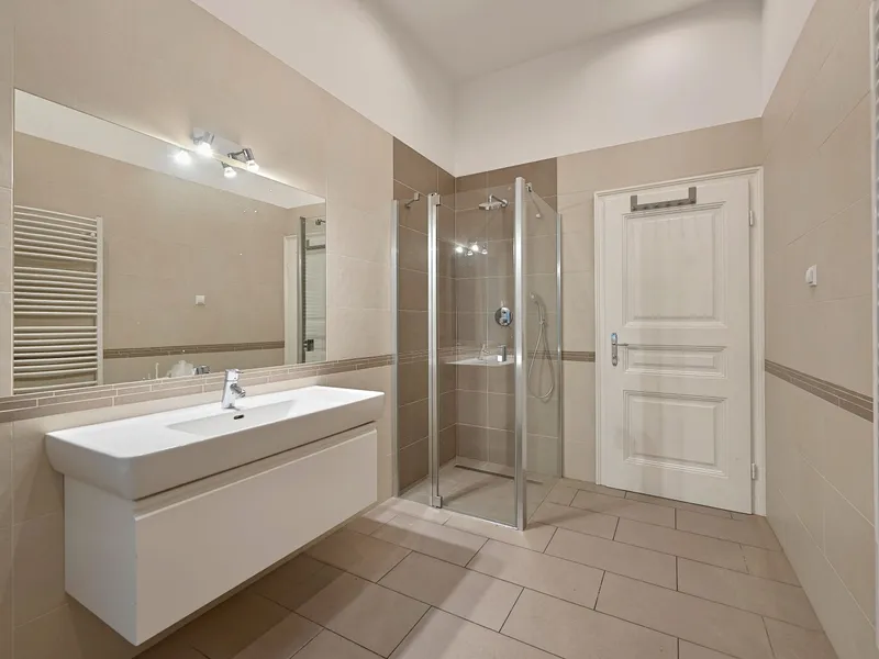 Zeitlos-moderne Badezimmerausstattung mit edlen Oberflächen