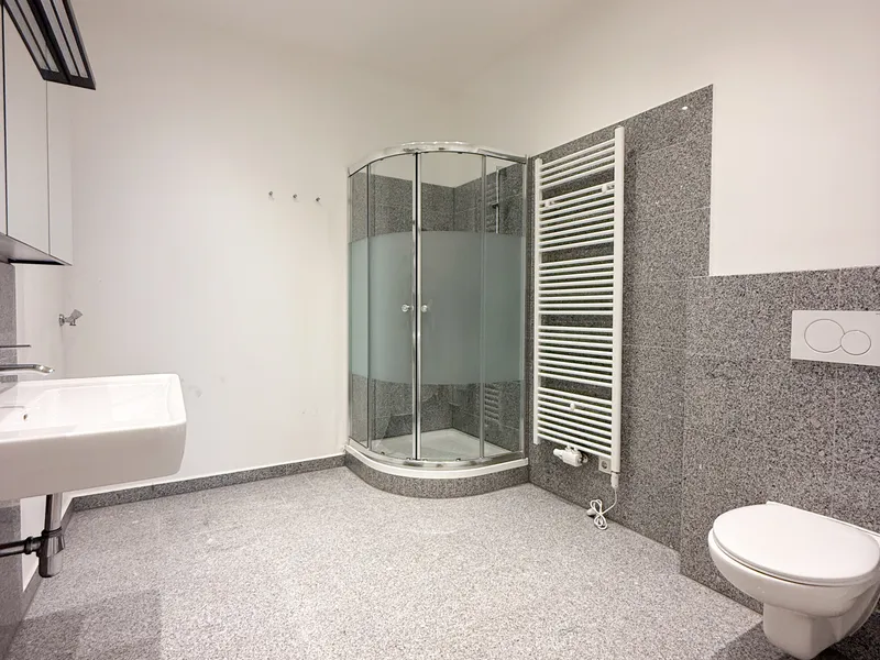 Zweites Badezimmer mit Dusche, WC, Handwaschbecken und Waschmaschinenanschluss