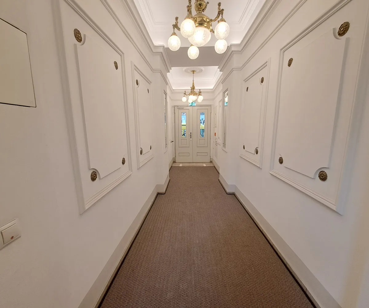 Der modernisierte Eingangsbereich empfängt Bewohner mit einem stilvollen Mix aus traditionellen Details und klarer, moderner Gestaltung. Ein neu installierter Lift, der in jedem Halbstock hält, schafft zusätzlichen Komfort.