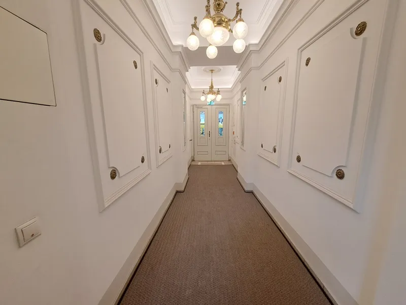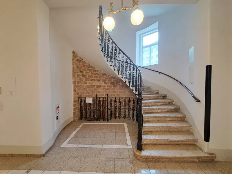 Der modernisierte Eingangsbereich empfängt Bewohner mit einem stilvollen Mix aus traditionellen Details und klarer, moderner Gestaltung. Ein neu installierter Lift, der in jedem Halbstock hält, schafft zusätzlichen Komfort.