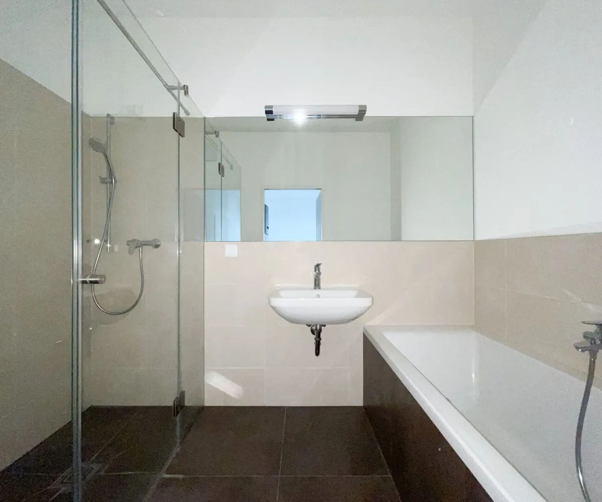 Über die Wohnküche samt angrenzenden, in den Innenhof ausgerichteten Balkon gelangen Sie durch einen praktisch angelegten Schrankraum in zwei weitere Zimmer sowie das Badezimmer, welches mit einer Dusche sowie Badewanne und einem Waschmaschinenanschluss ausgestattet ist.