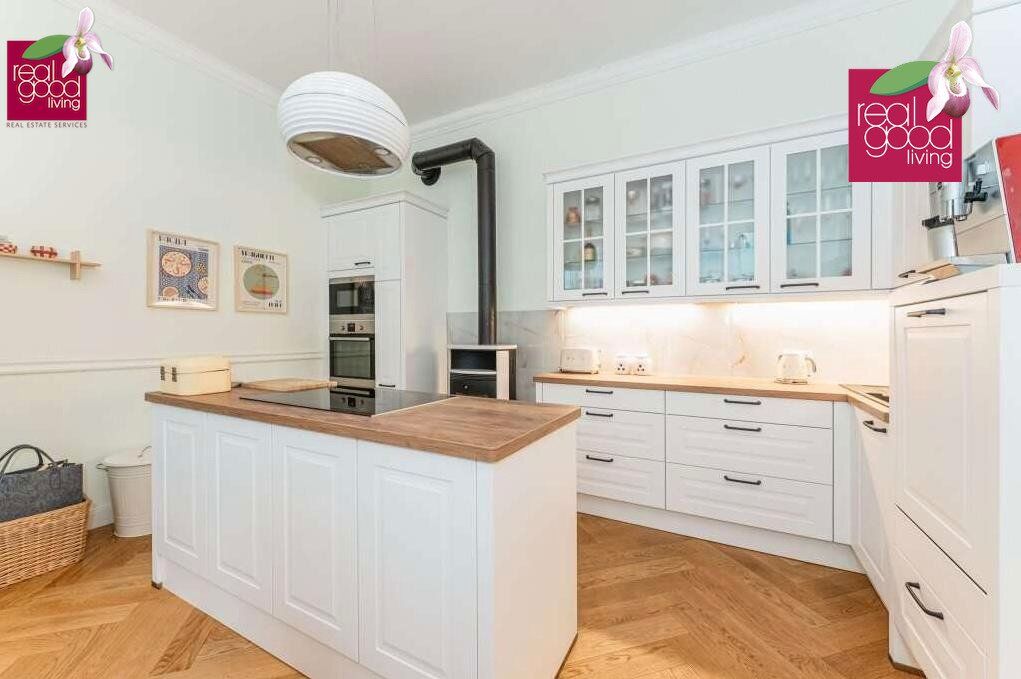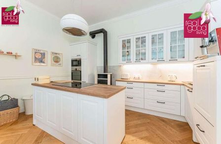 Die Wohnung wurde 2022 vollständig entkernt und neu gestaltet. Besonders hervorzuheben sind die großzügige Wohnküche mit Kaminofen sowie die seltene Raumaufteilung mit 2 Schlafzimmern, 2 Bädern und 2 separaten WCs – ein echtes Highlight im klassischen Altbau.