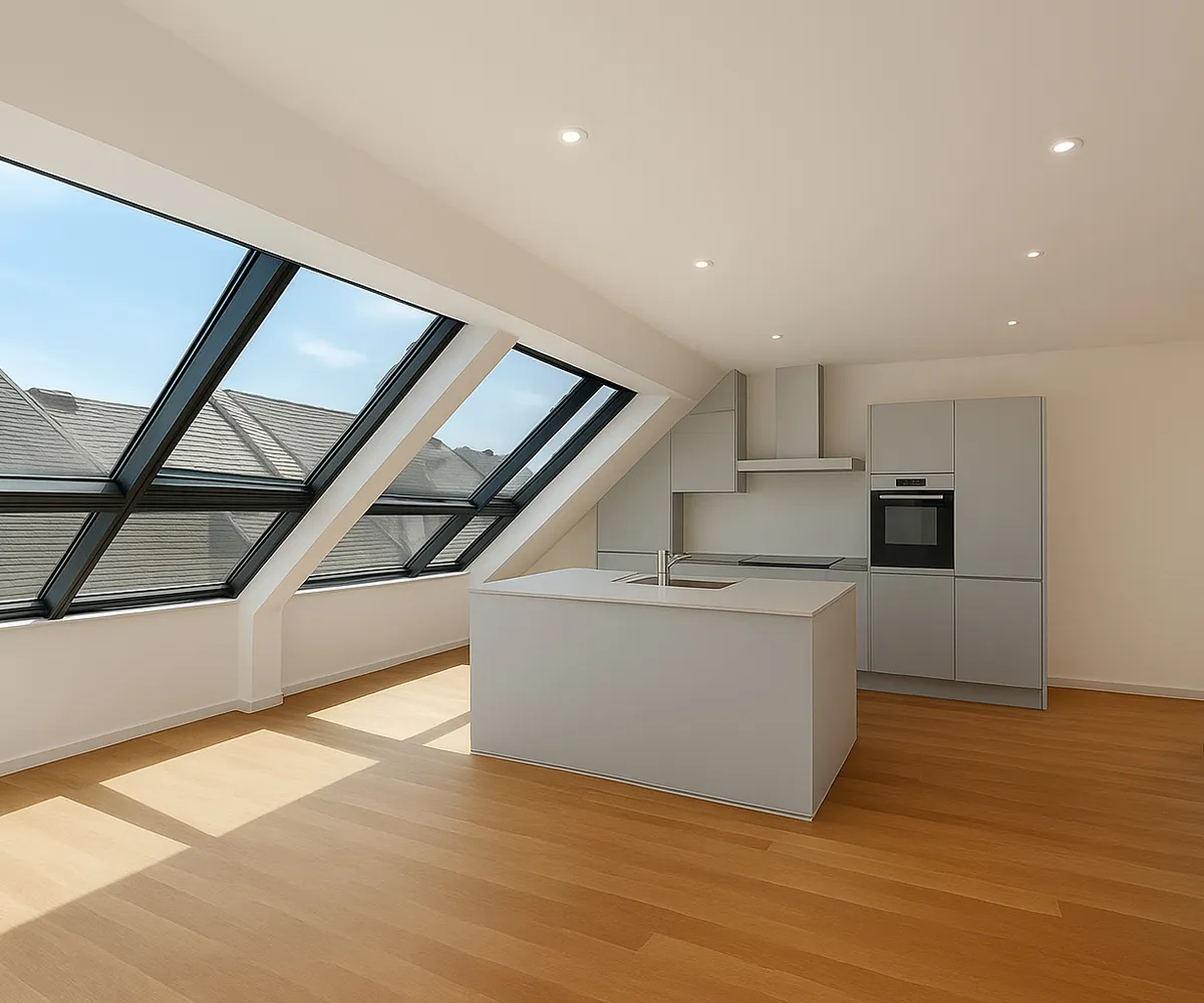Im oberen Dachgeschoß eröffnet sich der großzügige Wohnsalon – ein beeindruckender, offener Lebensraum mit traumhaftem Fernblick über die Dächer Wiens. Die südwestlich ausgerichtete Sonnenterrasse mit Blick in den ruhigen Innenhof ist direkt vom Wohnbereich aus zugänglich und lädt zum Entspannen im Freien ein.