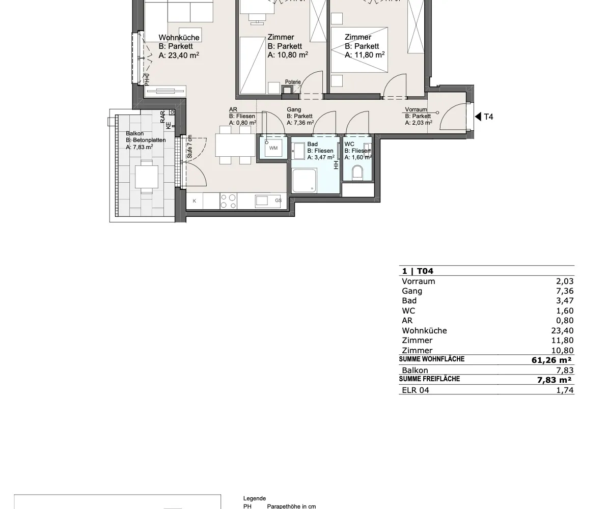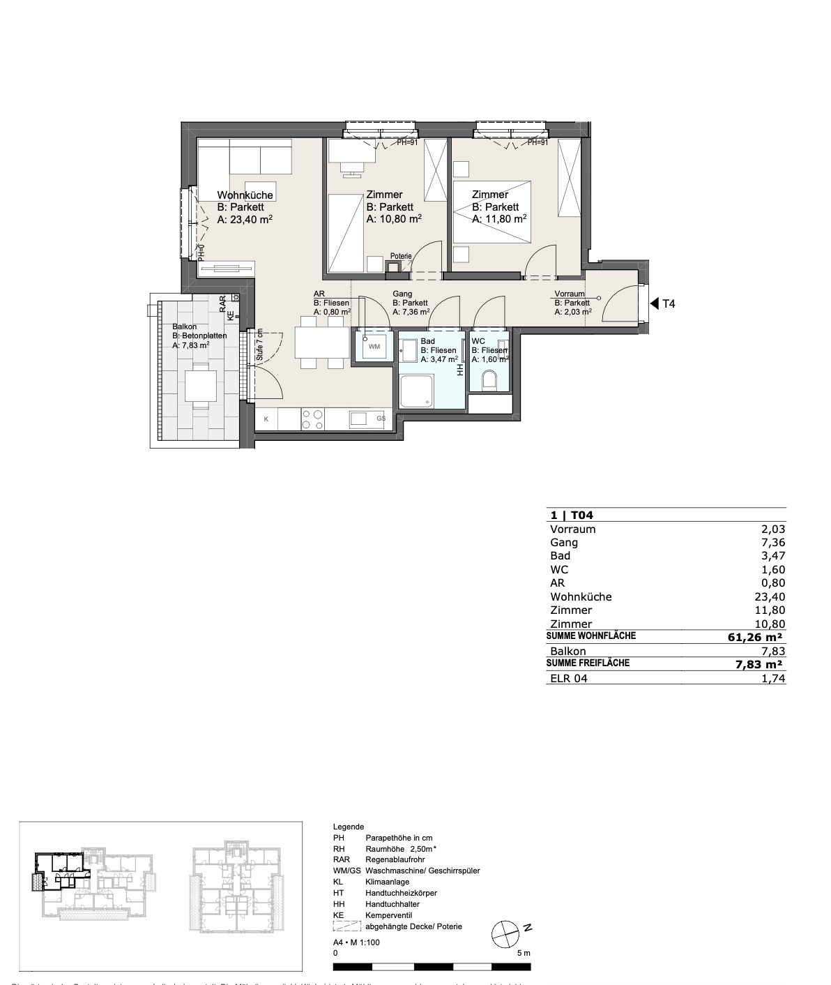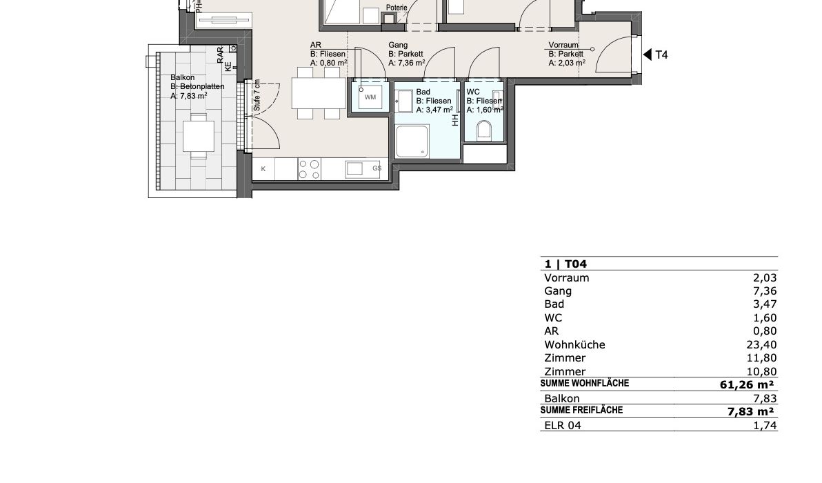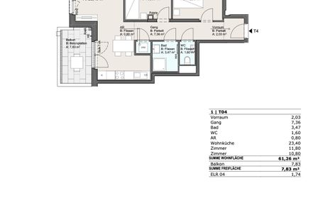 Die Wohnung liegt im 1. Liftstock und bietet eine durchdachte Wohnfläche von ca. 61 m². Alle Räume sind zentral vom Vorraum aus begehbar. Der ca. 8 m² Balkon ist von der Wohnküche aus zugänglich.