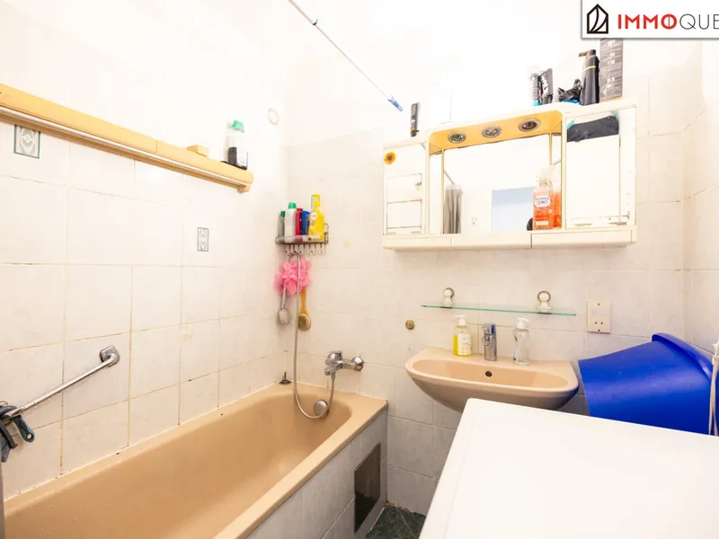 Die separate Küche mit Fenster ist funktional geschnitten und bietet auch bei Modernisierung vielfältige Möglichkeiten. Das Badezimmer ist mit Badewanne, Waschbecken und Waschmaschinenanschluss ausgestattet. Ein separates WC sowie ein praktischer Abstellraum innerhalb der Wohnung sorgen für zusätzlichen Komfort.
