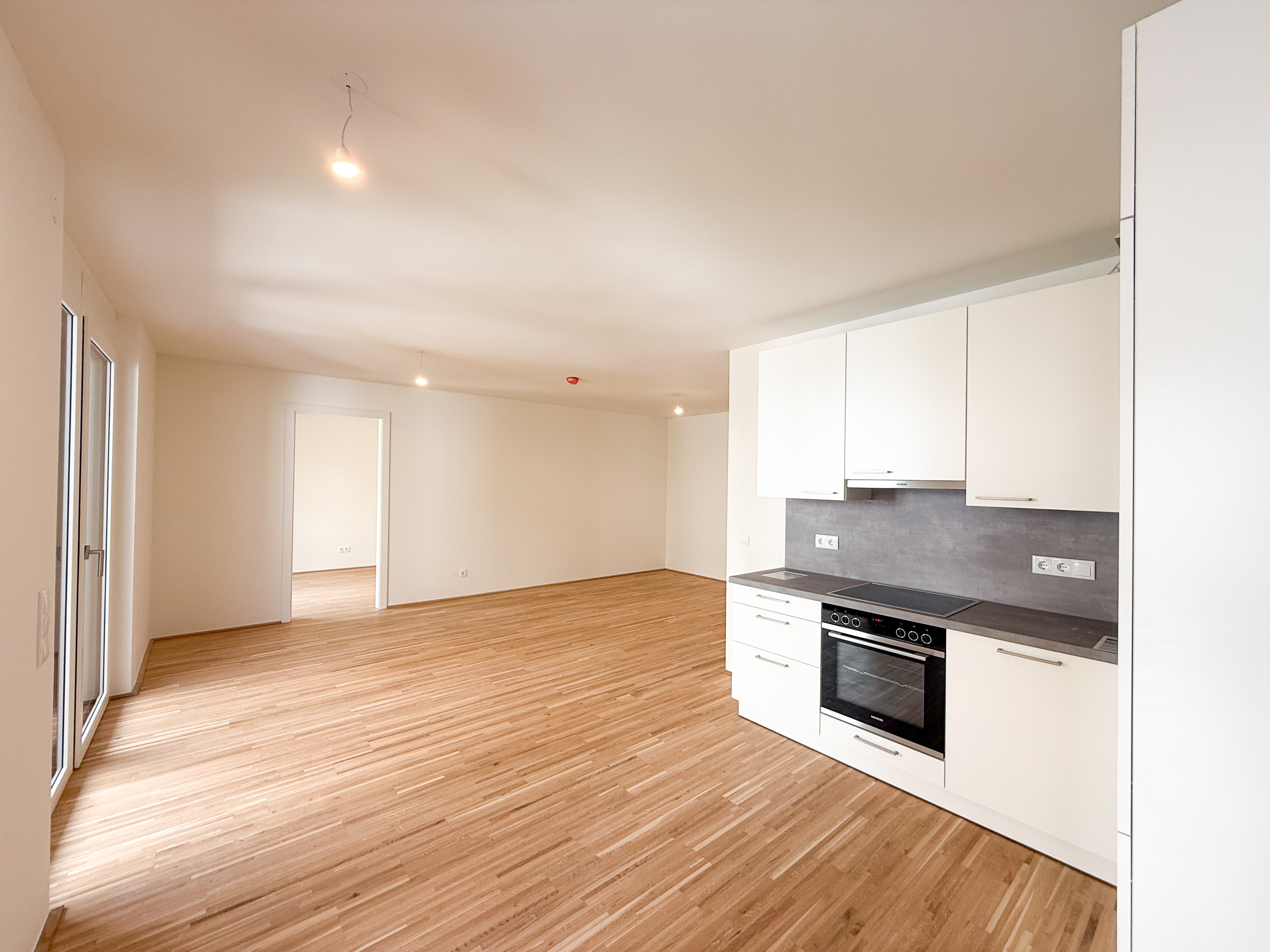 Großzügige Wohnküche (ca. 33,27 m²) mit direktem Zugang zu Loggia & Balkon