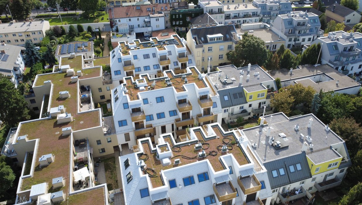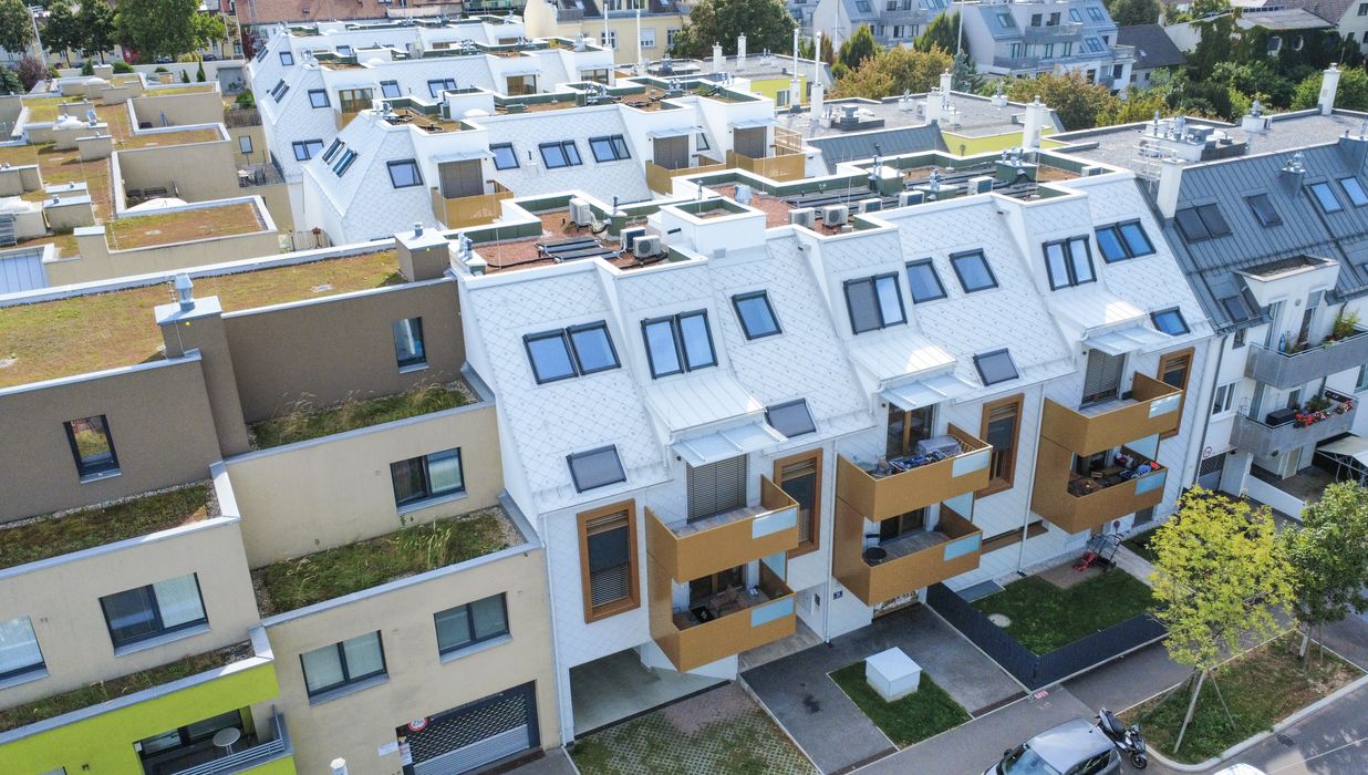 Die Anlage überzeugt mit energieeffizienter Bauweise (HWB 24,5–27,9 kWh/m²a), begrünten Dachflächen, Photovoltaik sowie einem attraktiven Freiraumkonzept mit Spielplatz und Aufenthaltszonen im Grünen.