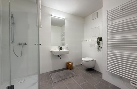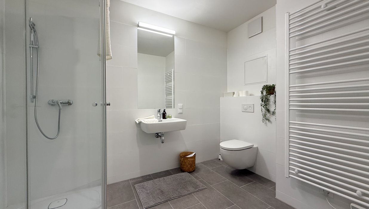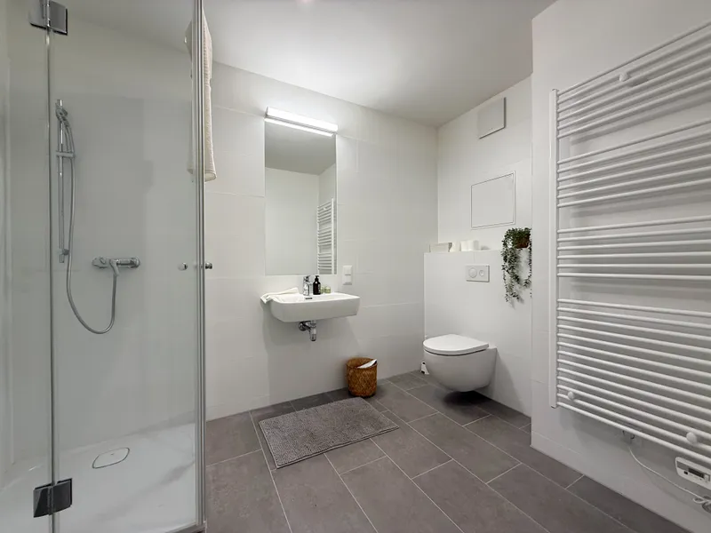 Neubauqualität mit hochwertigem Parkett und modernen Fliesen in den Sanitärräumen