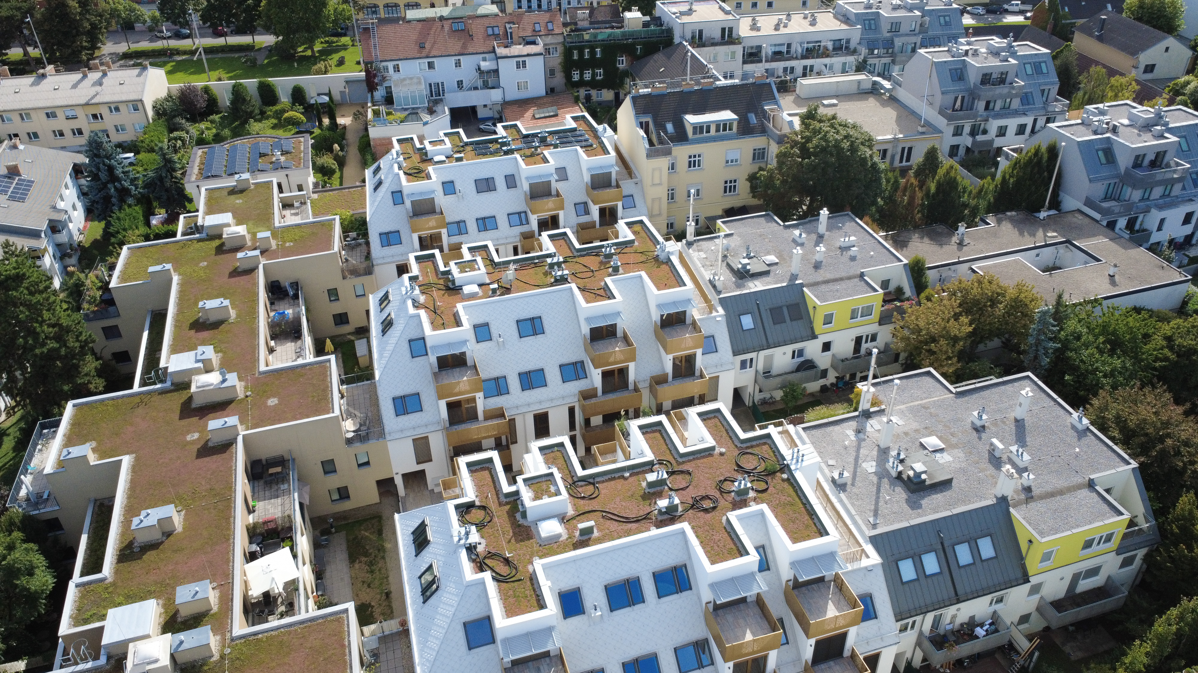 Die Anlage überzeugt mit energieeffizienter Bauweise (HWB 24,5–27,9 kWh/m²a), begrünten Dachflächen, Photovoltaik sowie einem attraktiven Freiraumkonzept mit Spielplatz und Aufenthaltszonen im Grünen.