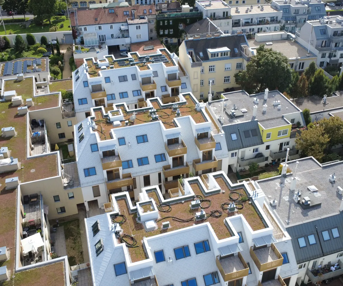 Die Anlage überzeugt mit energieeffizienter Bauweise (HWB 24,5–27,9 kWh/m²a), begrünten Dachflächen, Photovoltaik sowie einem attraktiven Freiraumkonzept mit Spielplatz und Aufenthaltszonen im Grünen.