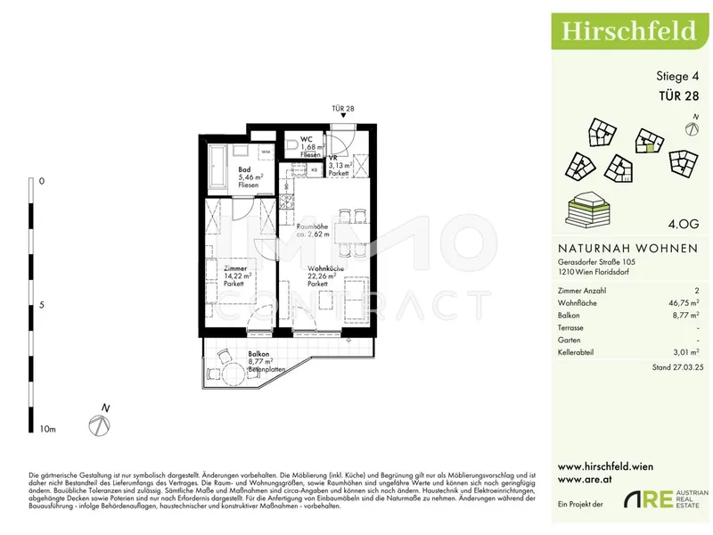 Hirschfeld ist ein beschauliches Viertel am Wiener Stadtrand. Die Metropole im Rücken verheißt jedem Nachhausekommen ein Naturerlebnis und Entspannung. Wer gerne mit den Wiener Linien unterwegs ist, nimmt am besten die Autobuslinie 32A ab Kollarzgasse bis zum U- und S-Bahn-Knotenpunkt Leopoldau. Von hier aus ermöglichen die U1 in Richtung Zentrum sowie die Schnellbahnlinien S1, S2 und S7 eine rasche Verbindung stadtein- und stadtauswärts. Alternativ verläuft die Straßenbahnlinie 31 entlang der Brünner Straße über Floridsdorf direkt bis Schottenring. Autofahrer profitieren von der nahegelegenen A22.