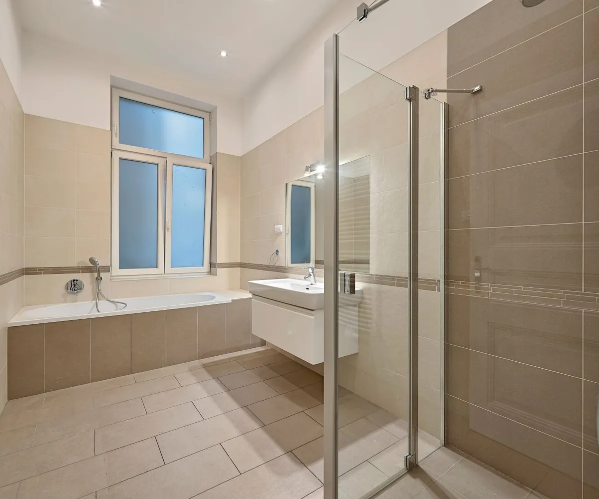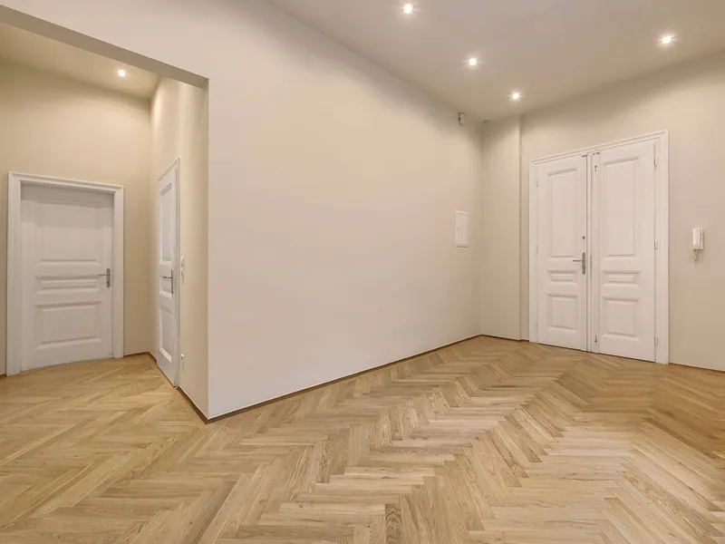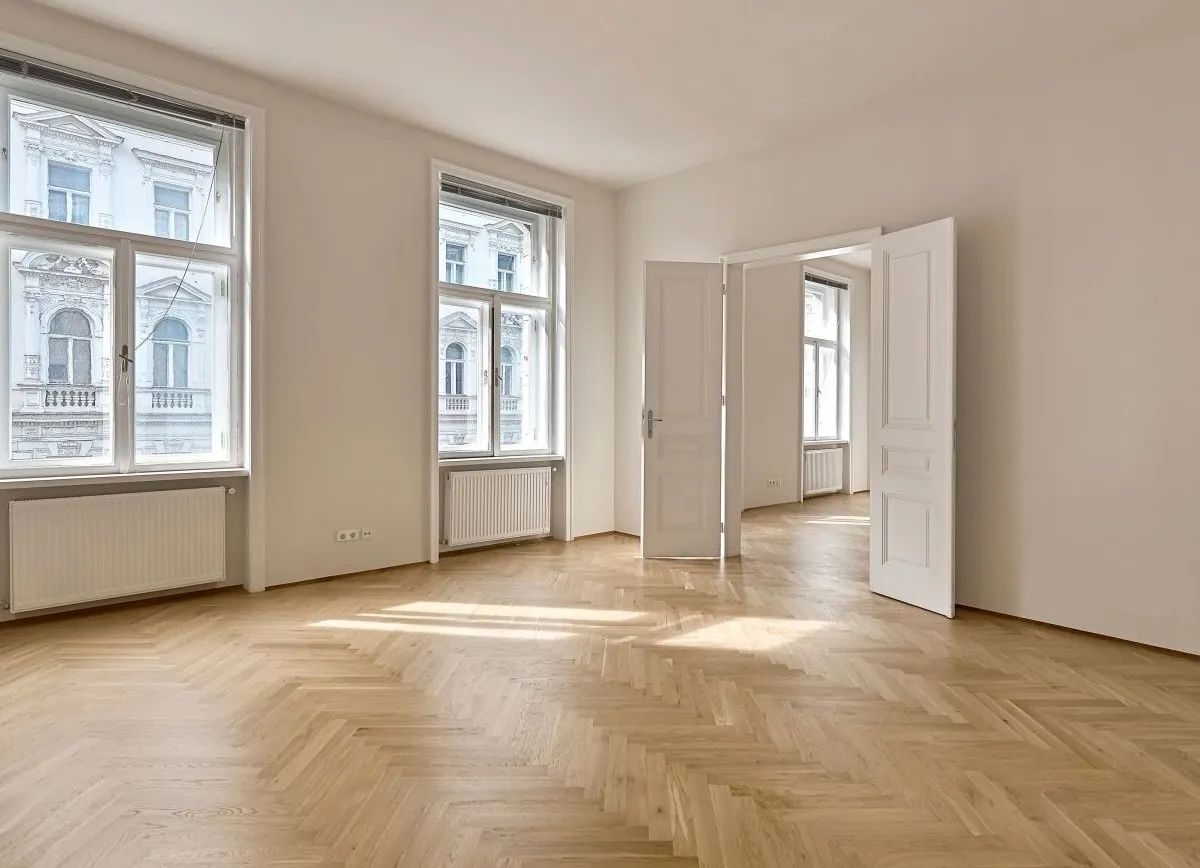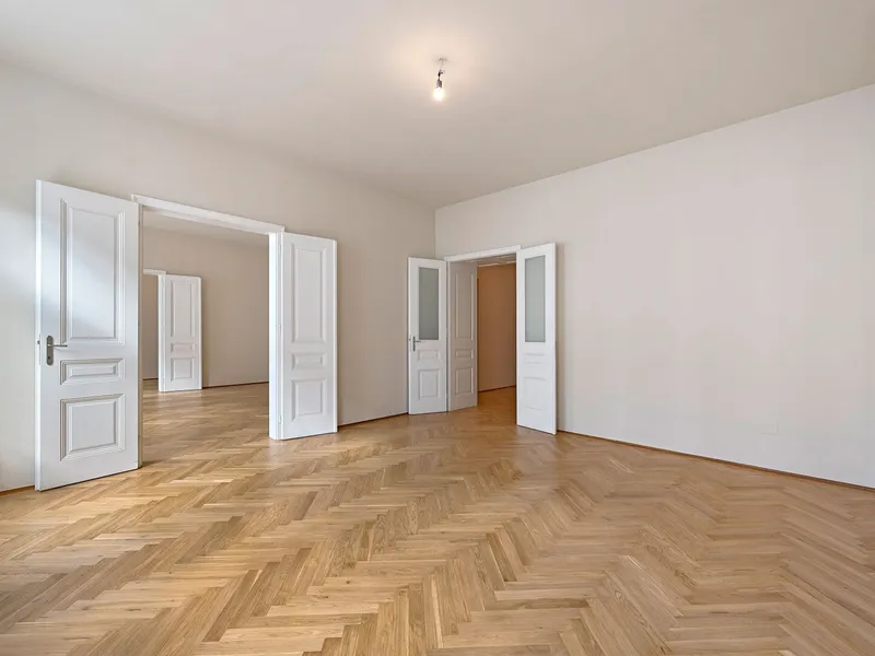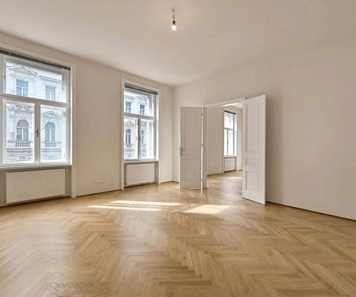 Die drei Haupträume sind Richtung Lerchenfelder Straße orientiert und weisen eine Südwest-Ausrichtung auf. Das großzügige Schlafzimmer ist in den ruhigen Innenhof nach Nordosten ausgerichtet.