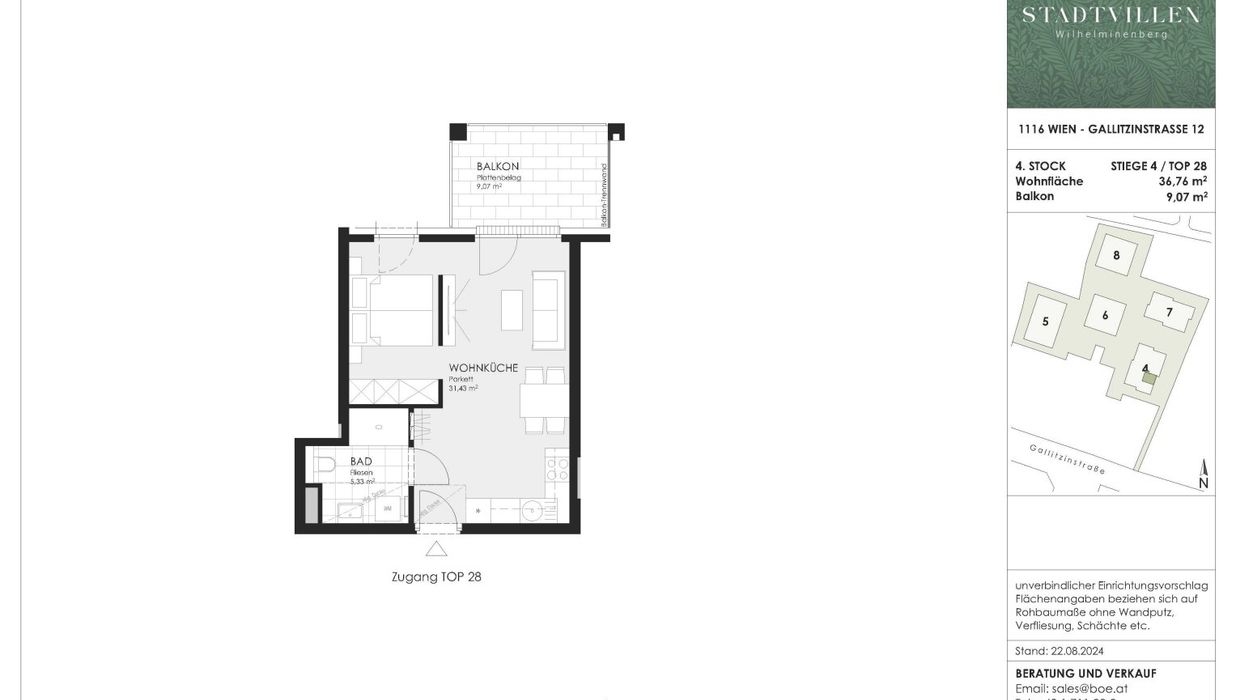 Die Top 4.28 ist eine charmante 1,5 Zimmer Wohnung mit einem großen Balkon ( 9,07 m² ).