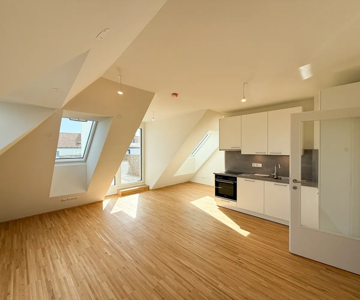 Diese moderne 3-Zimmer-Wohnung befindet sich im 2. Dachgeschoss des Projekts Am Langen Felde 24 in Kagran und überzeugt durch ihre großzügige Wohnküche, eine durchdachte Raumaufteilung sowie zwei sonnige Terrassen.