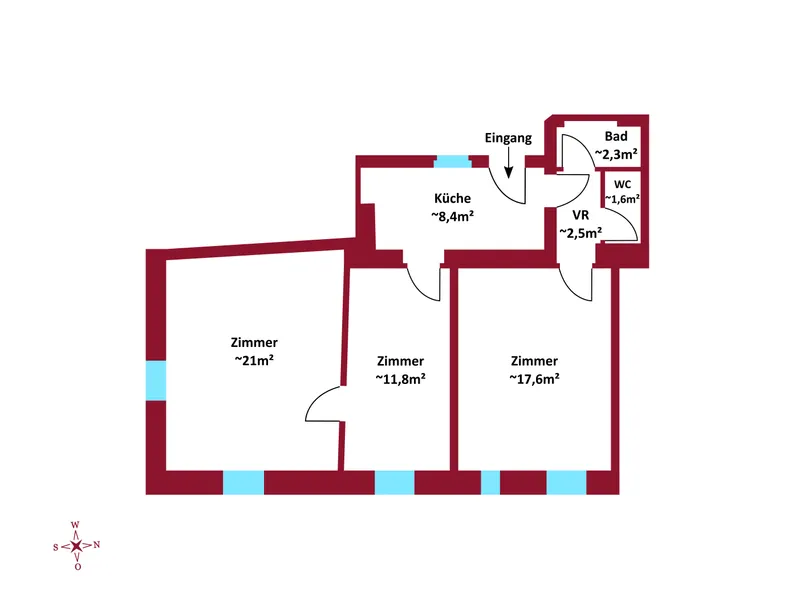 Die Wohnung besteht aus 4 Zimmer, mit knapp 65m² Wohnfläche und gliedert sich in folgende, funktionelle Raumaufteilung: